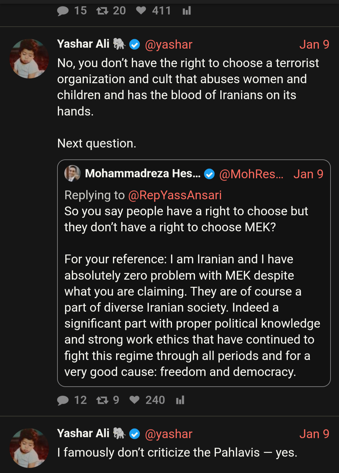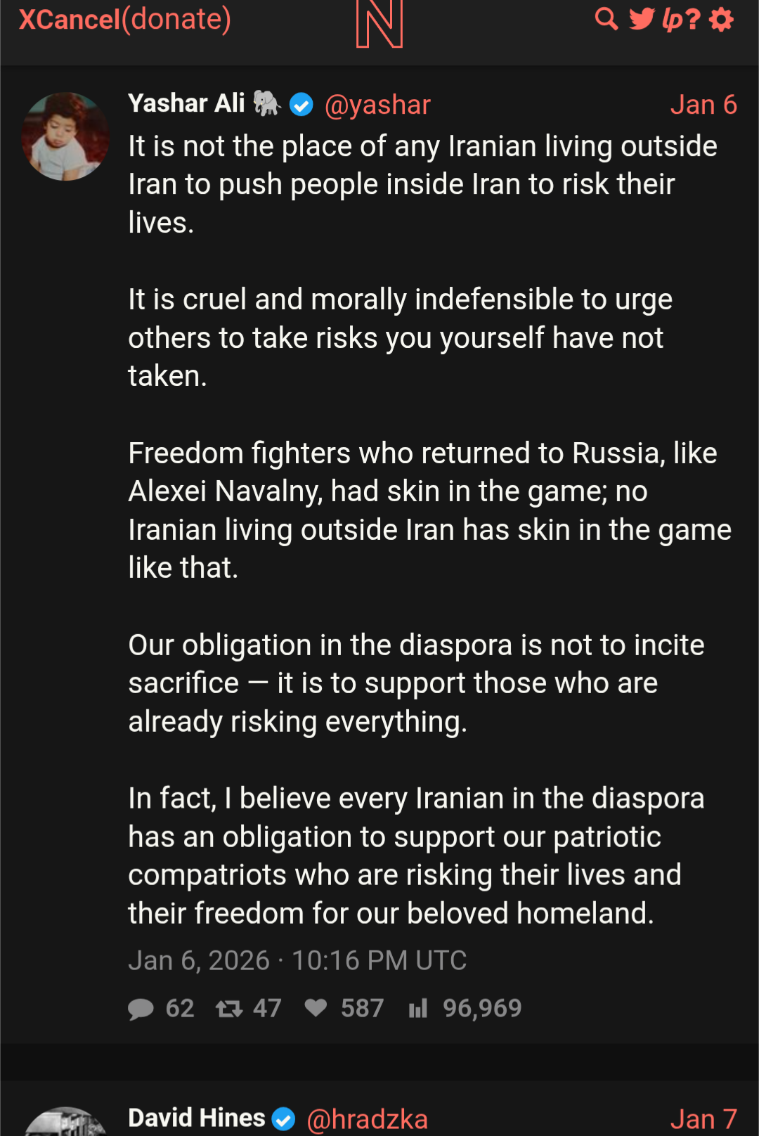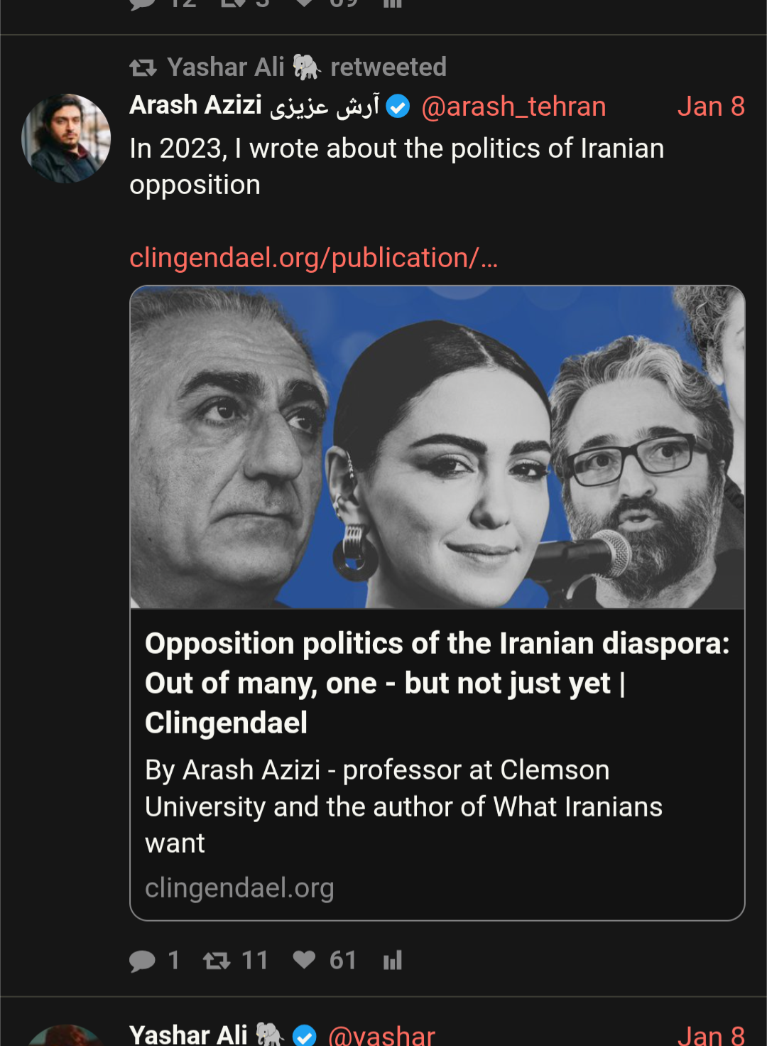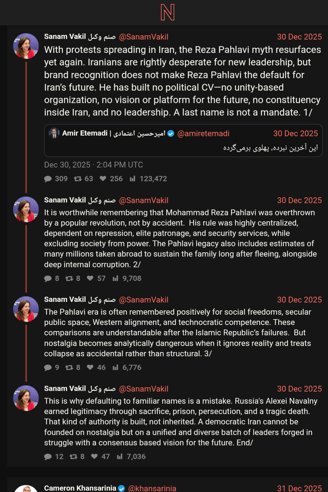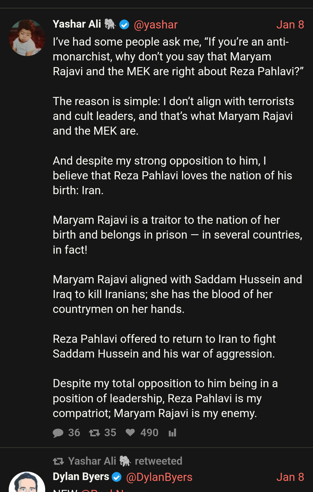I like reading this guy stuff for updates about Iran currently. Yes, he's a liberal. Yes, he's a Democrat voter. Yes he has a lot of normie takes but also he's in iranian-american who despises monarchists and he hates the Shah so he says some interesting stuff about the ones who keep shilling the shah