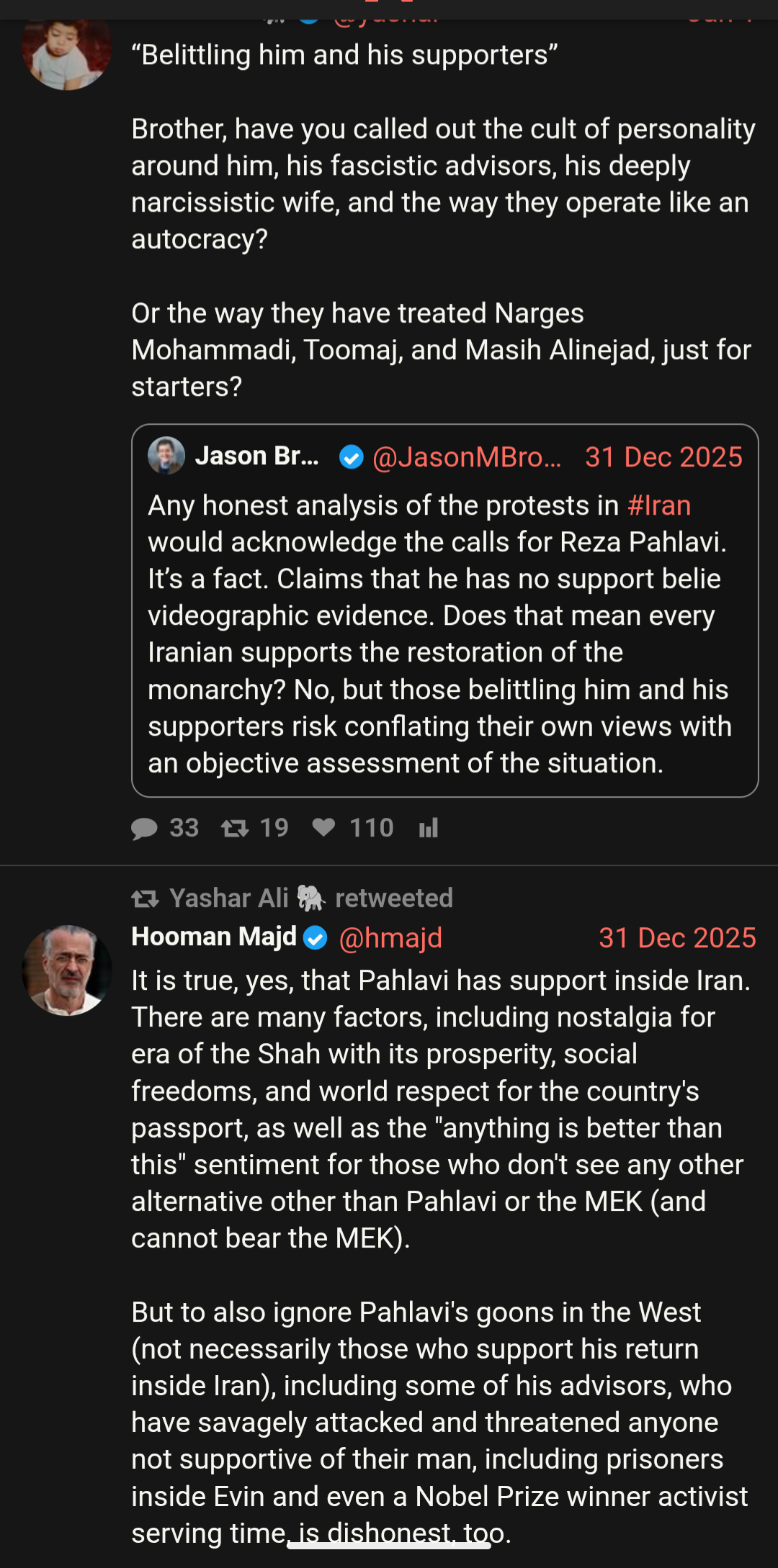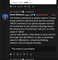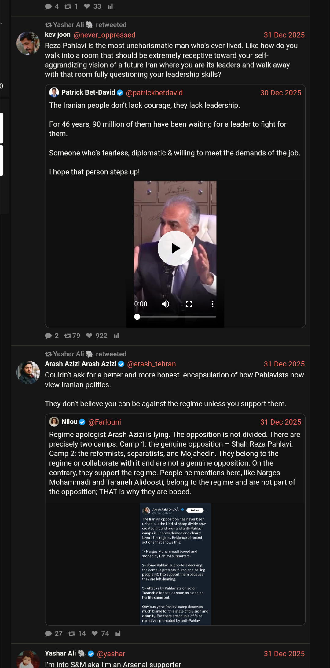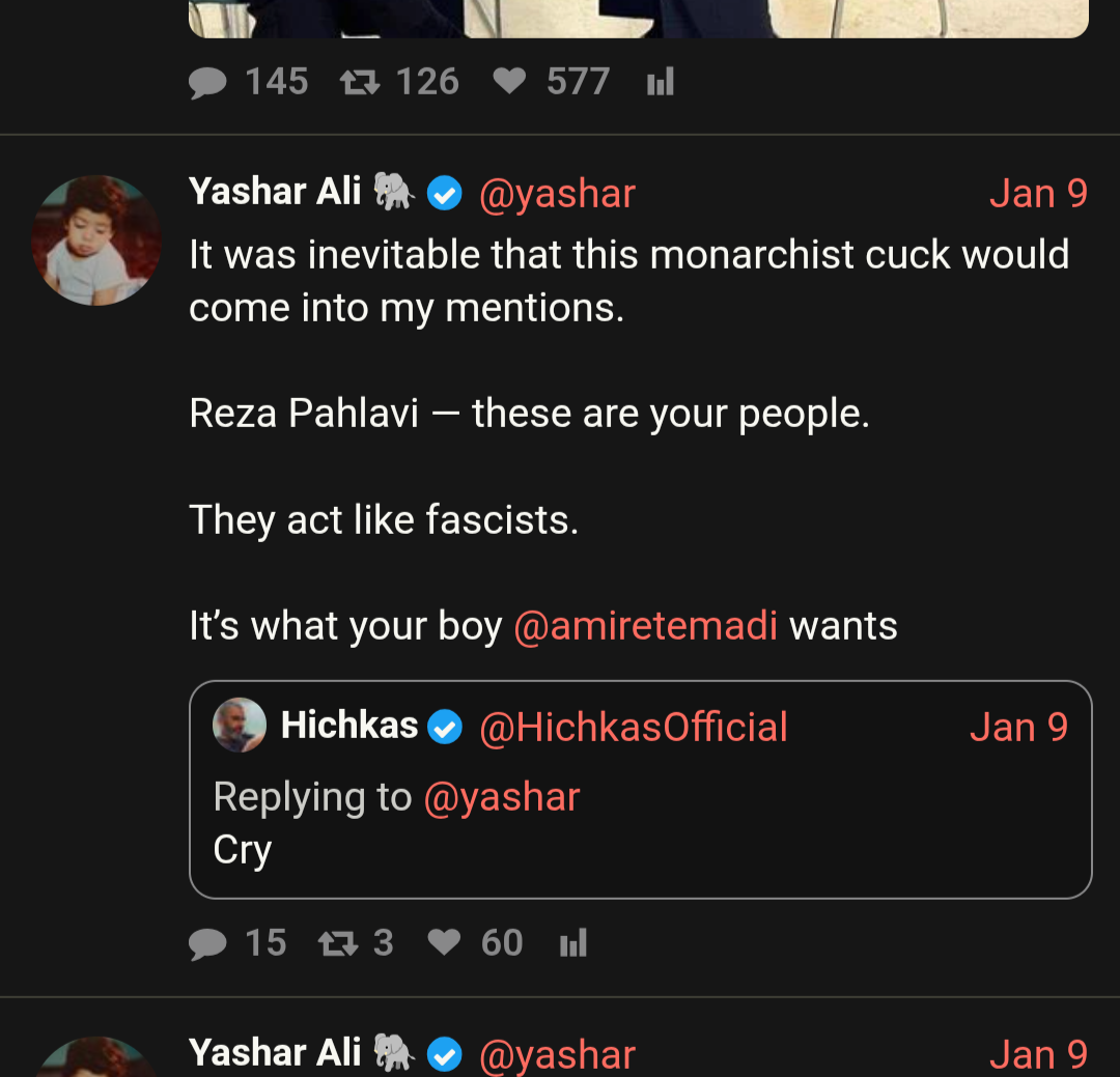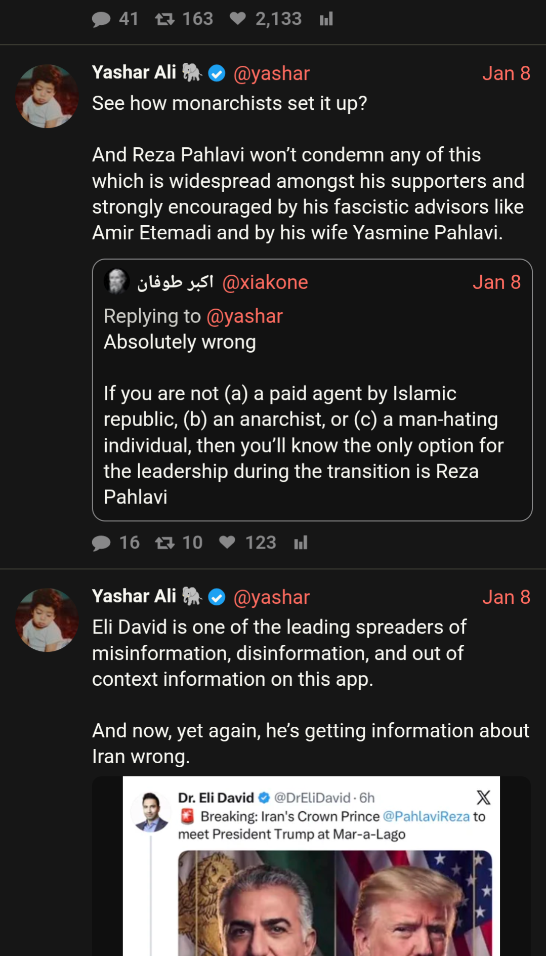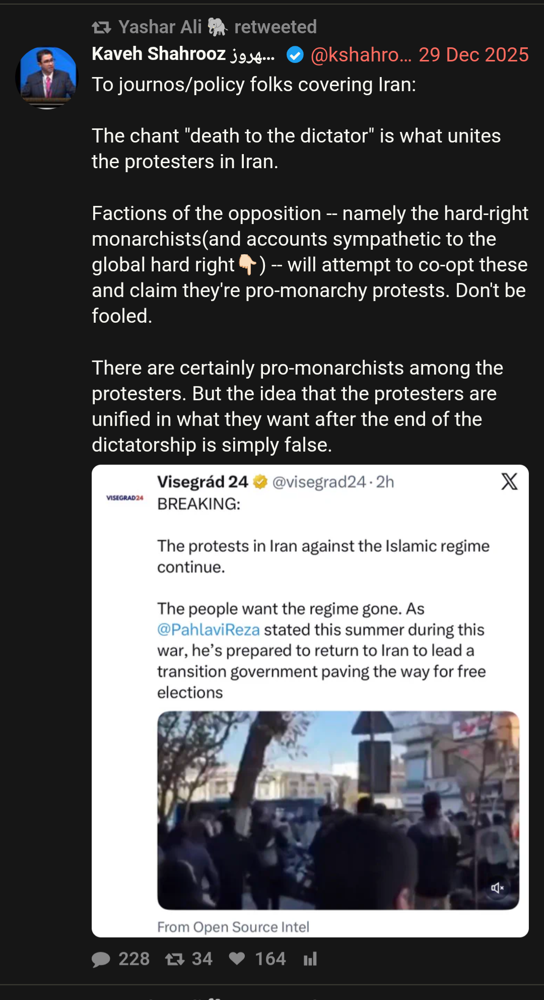 I like reading this guy stuff for updates about Iran currently. Yes, he's a liberal. Yes, he's a Democrat voter. Yes he has a lot of normie takes but also he's in iranian-american who despises monarchists and he hates the Shah so he says some interesting stuff about the ones who keep shilling the shah