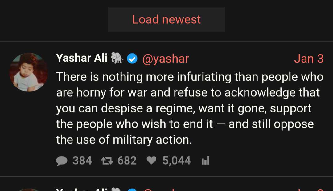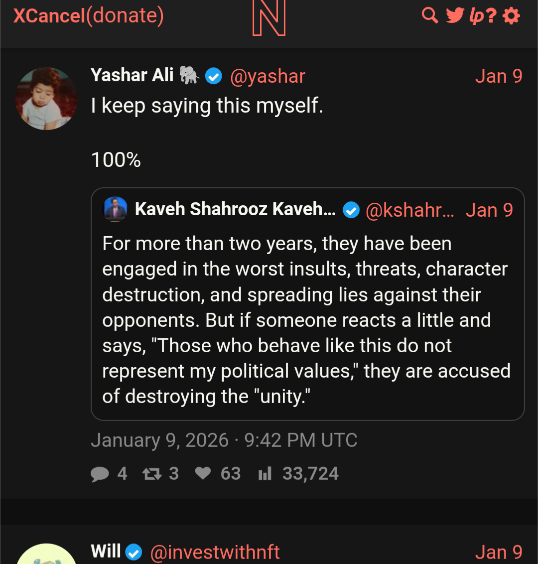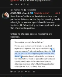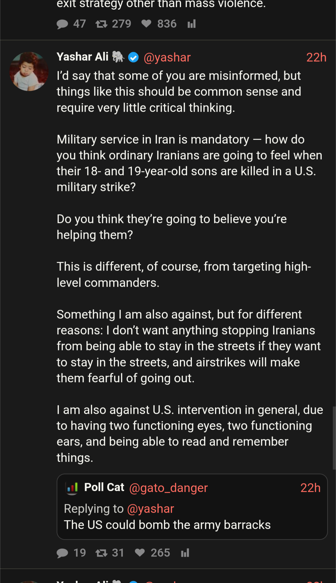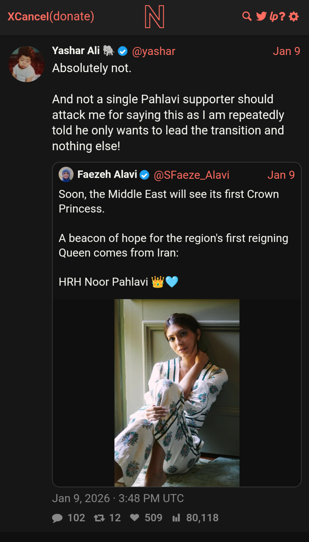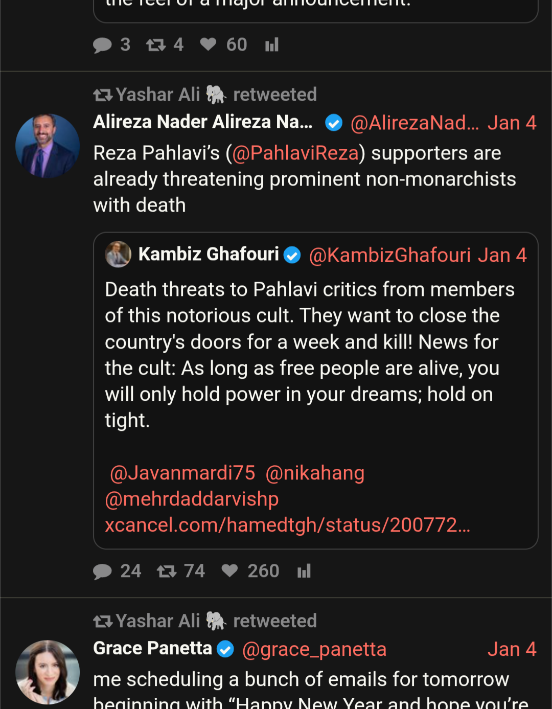 I like reading this guy stuff for updates about Iran currently. Yes, he's a liberal. Yes, he's a Democrat voter. Yes he has a lot of normie takes but also he's in iranian-american who despises monarchists and he hates the Shah so he says some interesting stuff about the ones who keep shilling the shah