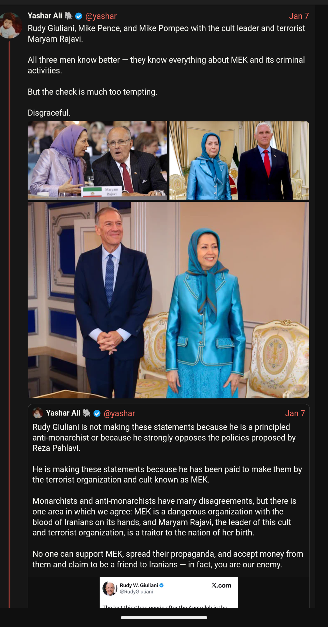 i had some tangential interactions with them hanging around green movement people 10 years ago. The most nutty was pro-israel kahanist while being an alt-right ayran race supporter. btw i saw their protest yesterday with large posters of the shah, make iran great again, and there was a TV van playing a huge video of him giving a speech. it was like the fucking moonies or scientology.