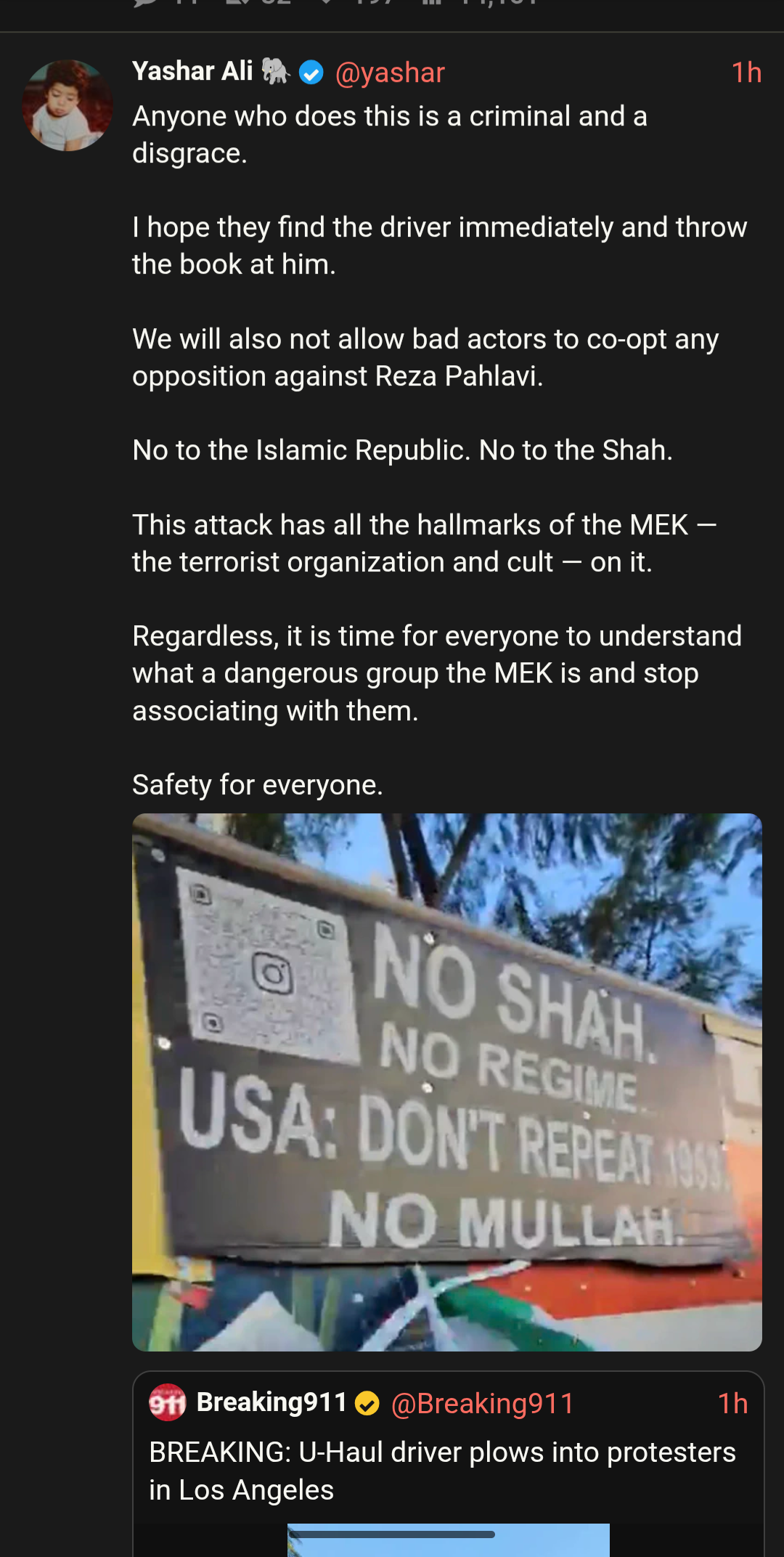Oh hey here's a video of a Uhaul with anti-monarchist and anti-mullah slogans plowing through a crowd of Pahlavifags in Los Angeles. Doesn't look like anyone got hurt but damn you can't stop Iranian emigres from being crazy. I wonder if it's a MEKfag…