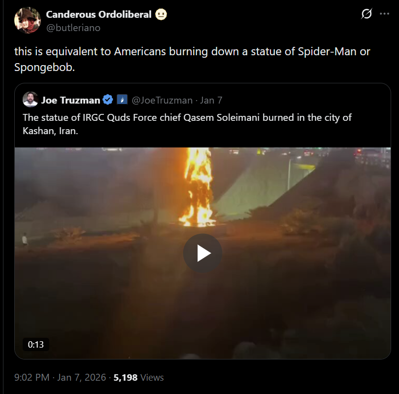 I just wanted to make one small point about the conflict between Iran's wealthy capitalists and Iran's theocratic government, a line of dickheads showed up to be performatively wrong, to defend the revolutionary pottential of an israeli color revolution. it's absurd.