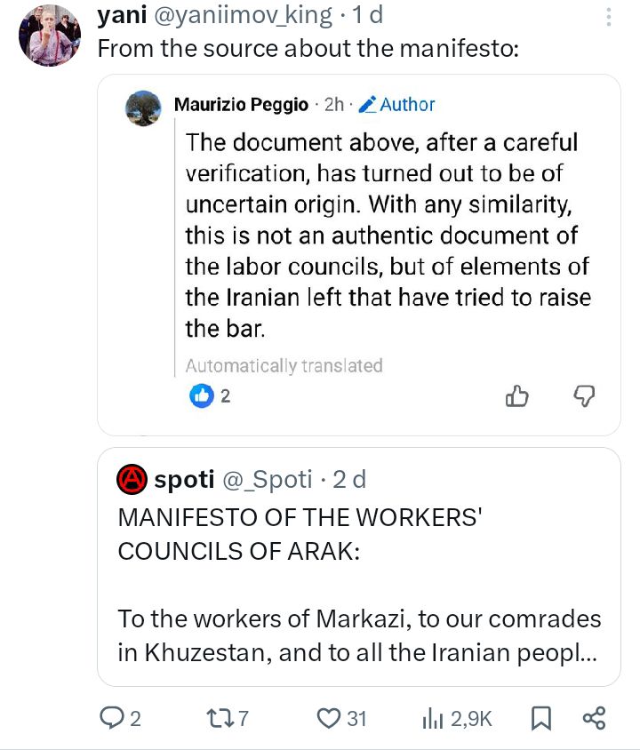 >Workplace control: From now on, the management of the Machine Manufacturing Company, AzarAb, and Wagon Pars factories will be in the hands of workers’ councils elected by the workers themselves. We no longer recognize managers appointed by the state or the regime’s puppet unions.https://cpiran.org/statement-of-the-workers-councils-of-arak-all-power-to-the-councils/>>2641220Also he hates the mek too