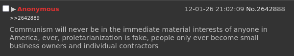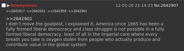 >>2642999If you think you’re getting socialism after you spent the last 500 years raping the rest of the earth you’re more deluded than any fox news grandpa, they at least understand their settler class interests
