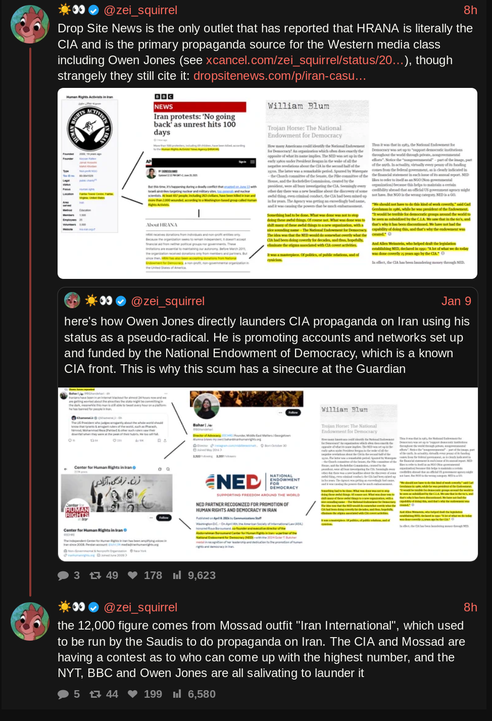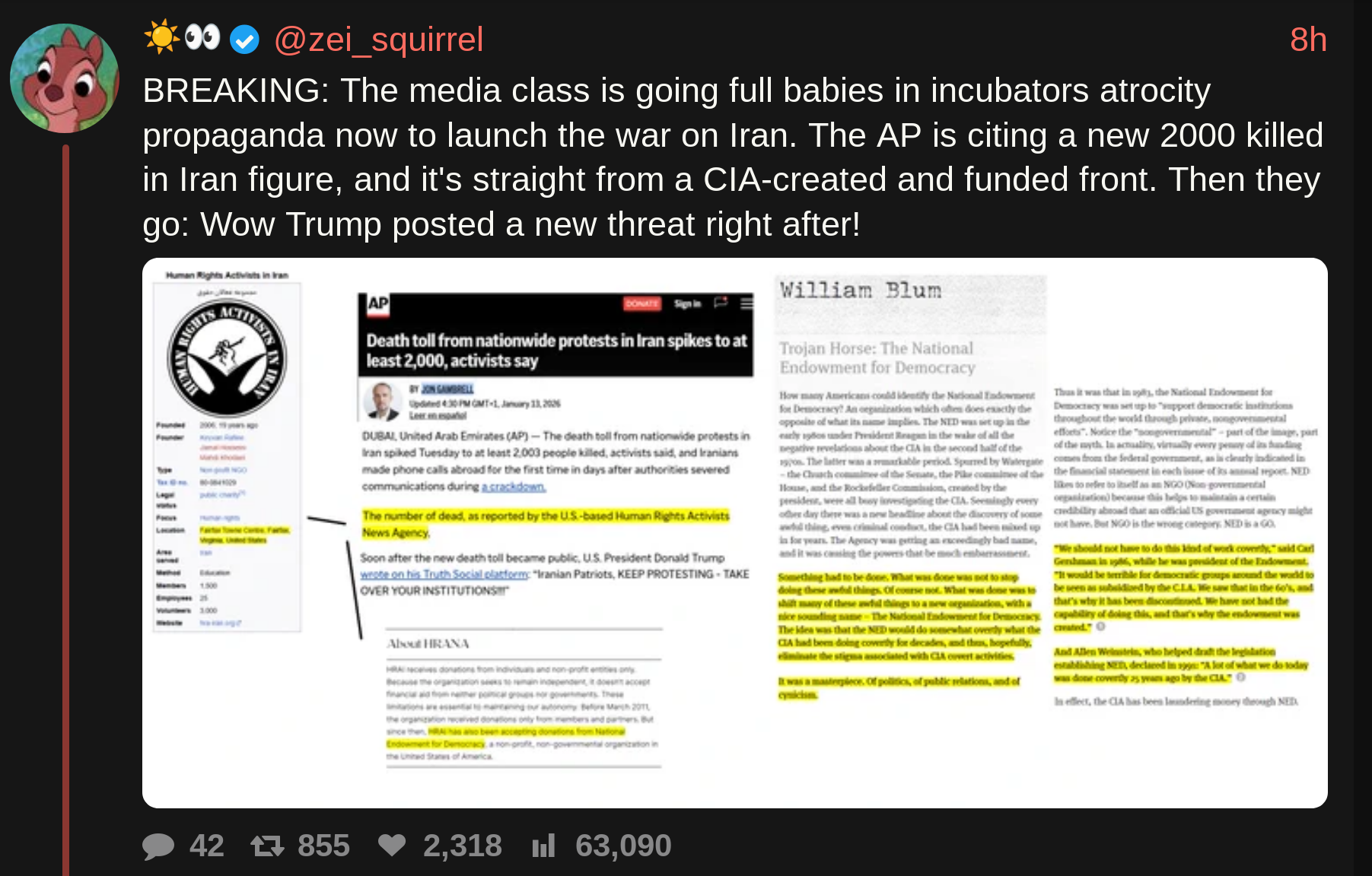 >immediately forgets about it 5 xeets after >>2643519So you have no answer on how misrepresenting the protests and giving the regime excuses to crush it is materially helping it when the west is fully capable of overthrowing the regime if it wanted. Nice.