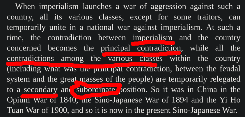 >>2645113"No war but class war" is a slogan applied to WW1 which was an inter-imperialist conflict. Universalizing it outside of its concrete material conditions to different ones in which it does not apply is opportunist sloganeering and very unprincipled behavior for a supposed communist.