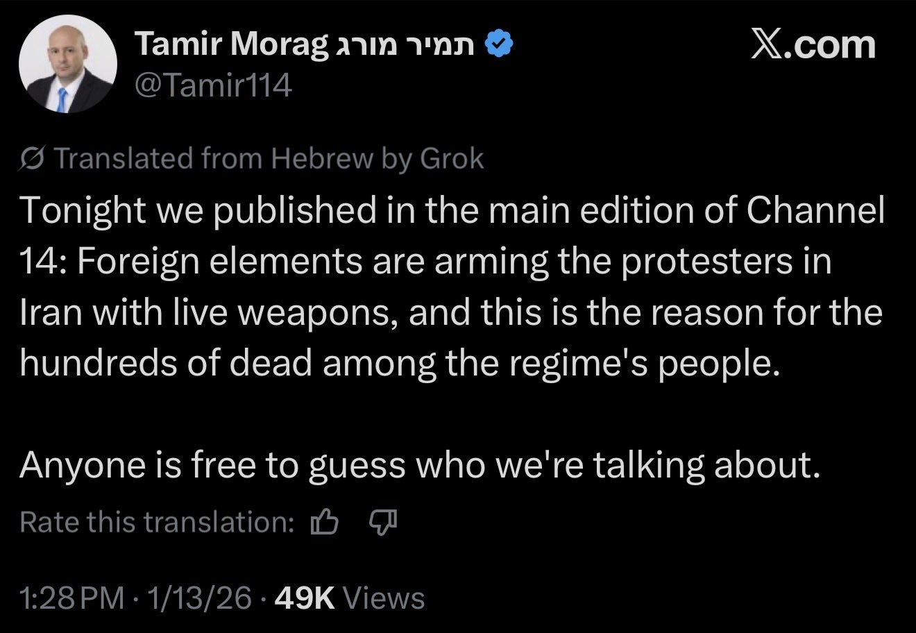 >>2645904>We announced this evening on Channel 14's main edition: Foreign elements are arming the protesters in Iran with firearms, and this is the reason for the hundreds of deaths among the regime's members. Anyone can guess who this isWow very authentic and genuine protests