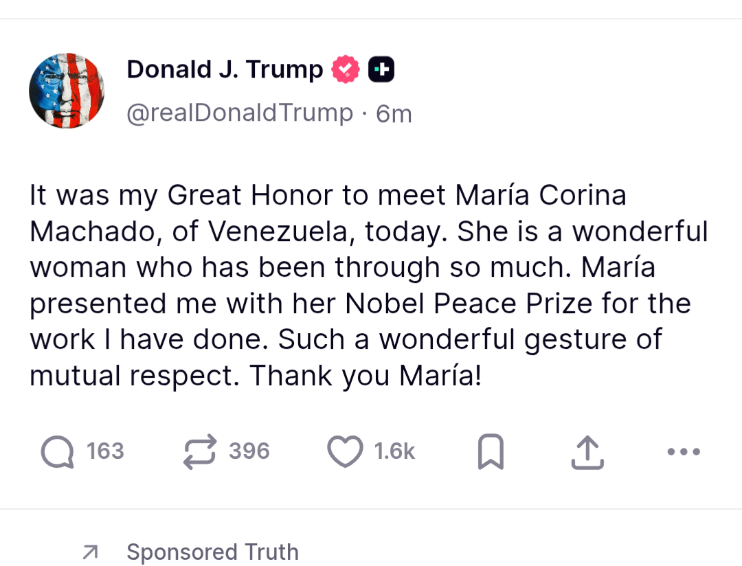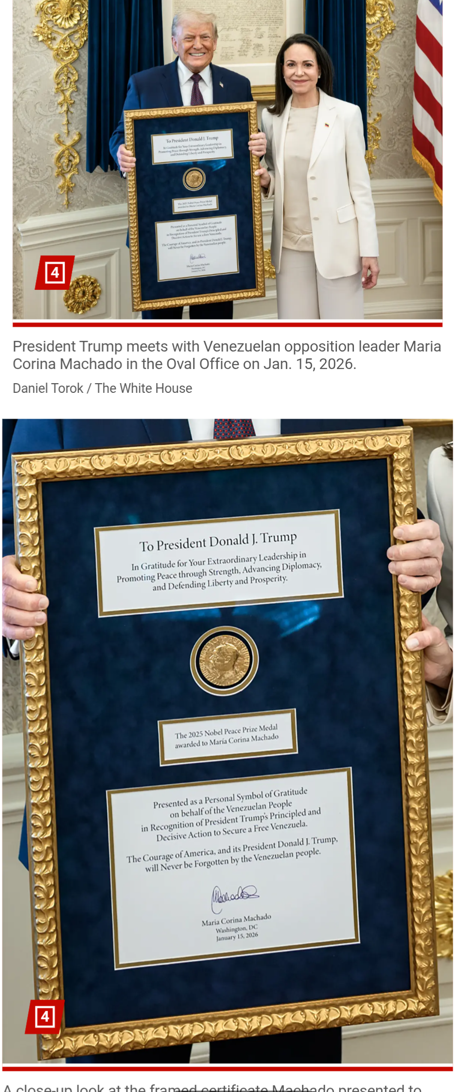 Driving the news: Machado met earlier in the day with Trump and said afterward on Fox News that she gifted him her non-transferable Nobel Peace Prize.