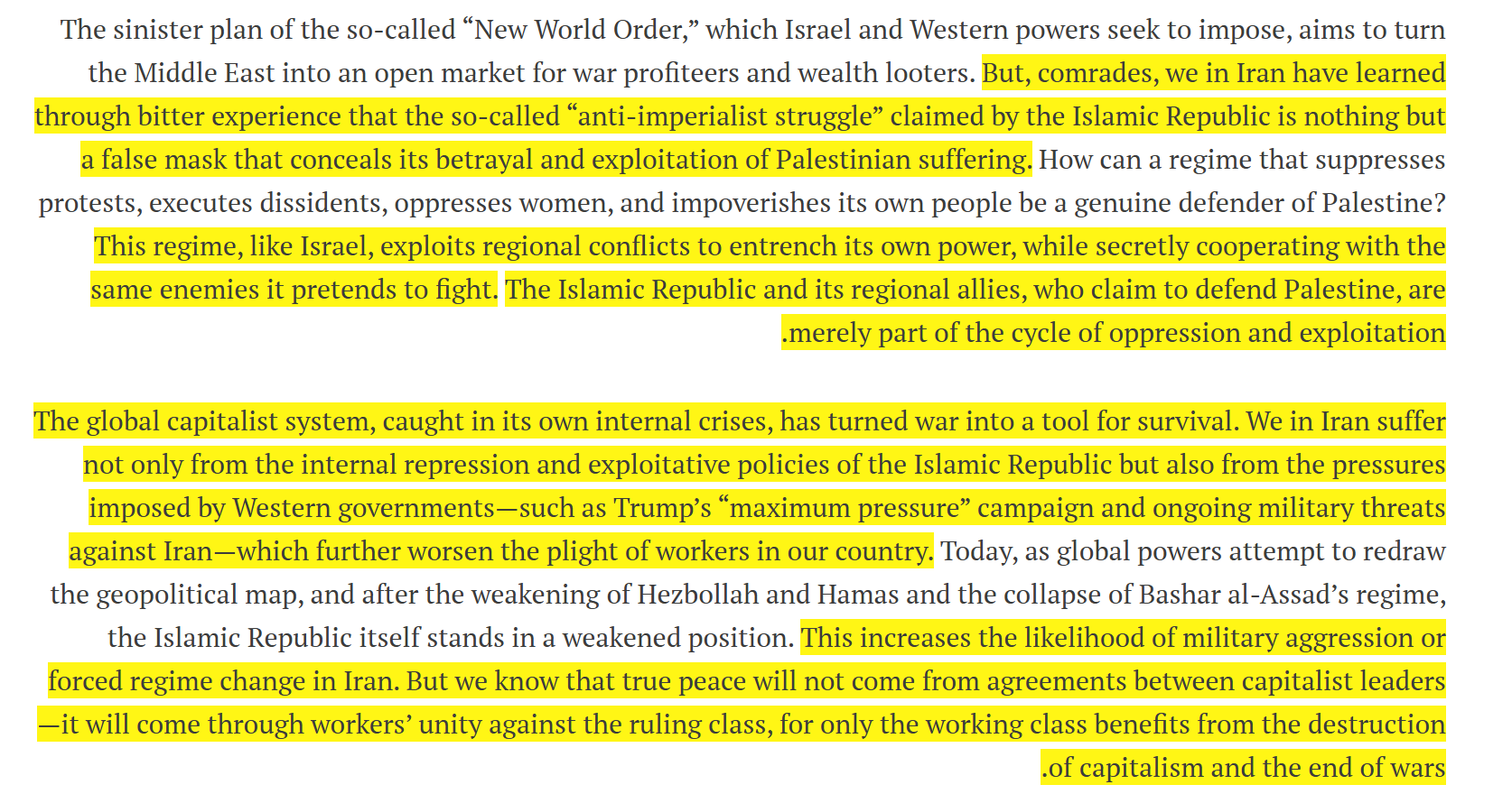 Does this mean they're in agreement on everything and Iran is secretly run by da juice? Of course not, that's conspiratorial and Kautskyist nonsense. They're united in so far as their class interests meet, mostly in suppressing workers and maintaining the status quo.