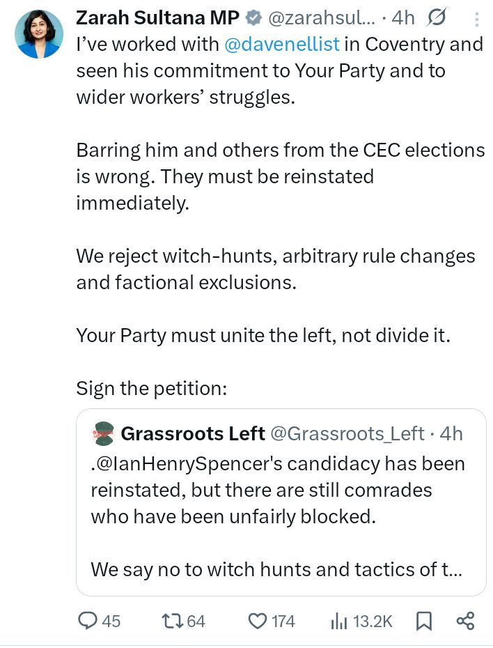 On the one hand, this would mean placing before the supporters of those bourgeois socialist of Corbyn and Sultana the recognition of their own inadequacies. Sultana's attempt at reinvigorating the British left behind a policy of complete nationalisation will not yield anything but failure as their political enemies will regroup even if they achieve power as well as the fact that they will be unable to deal with the historical situation. Sultana aims at the same program as Reform, i.e. a petty state nationalism, but with a left wing agenda.