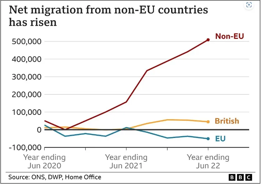 2. net migration graph with a line showing when the UK replaced its EU-era immigration system with an "australian style" points based system