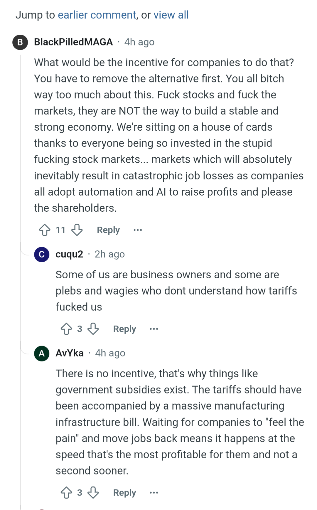 >>2652070Inflation when real wages rise is very good hecause the bourgeoisie gets double penetrated with rising labor and capital cost. Therefore tariffs are good. I will elucidate this in next thread