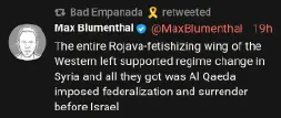>muh incomptentAANES has highest salaries in region despite being under siege, it is least corrupt of all regions as with testimonies of visitors and buisnessmen, SDF is most competent of all forces, and has won over great non-kurdish masses and earned genuine democratic progress despite adverse condition. SDF and what it have achieved in post-collapse Syria where authority devolves into local communities is a model to note for future revolutionaries and partisans in western world as it spirals into chaos and anarchy. It is model for establishing governance in hostile region controlled by religious fanatics and equivalent of neo-nazis. For creating a party and a counter-state from ground up.