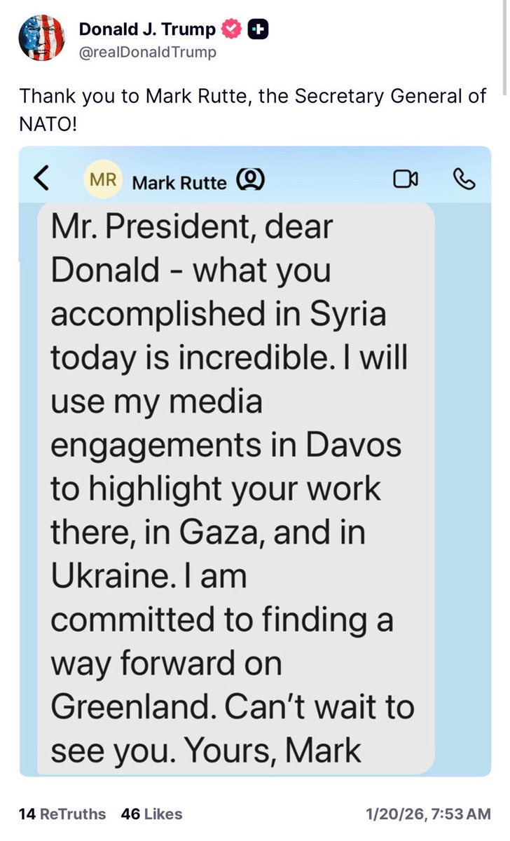 https://abc7.com/post/gavin-newsom-slams-world-leaders-davos-rolling-trump-stop-being-complicit/18440841/>Newsom slams world leaders for 'rolling over' to Trump: 'Stop being complicit'.>"I can't take this complicity. People rolling over. I should've brought a bunch of knee pads for all the world leaders," Newsom said. "I mean handing out crowns. I mean this is pathetic. Nobel prizes that are being given away."Aw. He's trying.