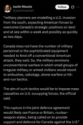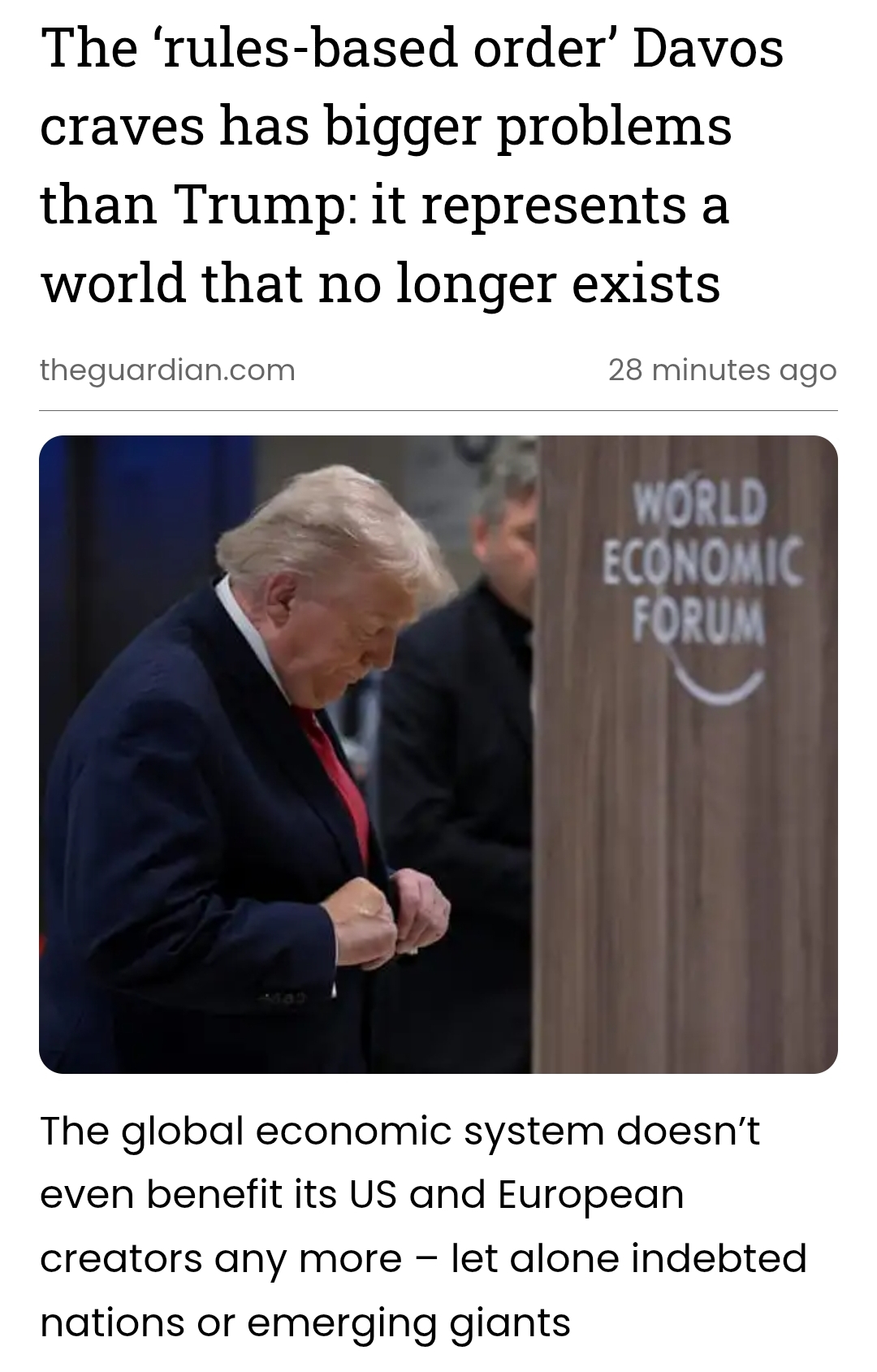 >The old world order (i.e. the Western coalition) is over and isn't coming back>Middle powers can no longer rely on the protection of great powers>Middle powers should not seek to appease great powers and should resist pressure from them>Canada sides unequivocally with Denmark over Greenland, and remains committed to NATO Article 5>smaller countries should seek a diversity of alliances and partners instead of being beholden and dependent on great powersHonestly couldn't believe my ears. Dude is basically saying that US hegemony is dead and that Canada shouldn't mourn it, that it should never seek to appease the Americans, and that it should be willing to defend itself before trying to appease aggressive neighbours.