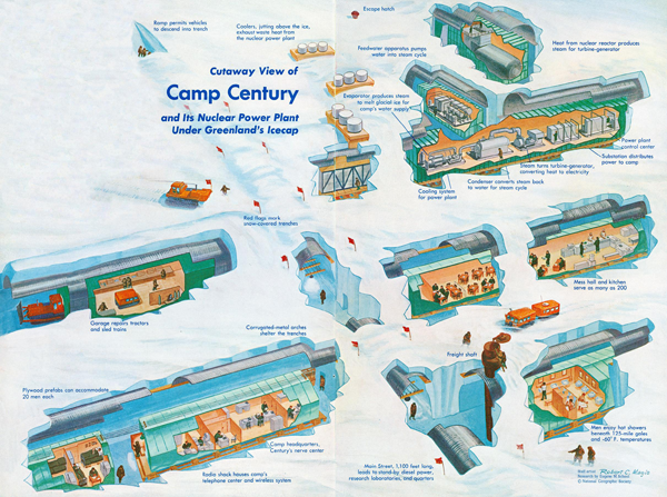 https://en.wikipedia.org/wiki/Project_Iceworm>Project Iceworm was a top secret United States Army program of the Cold War, which aimed to build a network of mobile nuclear missile launch sites under the Greenland ice sheet. The goal was to install a vast network of nuclear missile launch sites that could survive a first strike. This was according to the Danish Institute for International Studies which obtained declassified documents in 1996.[1][2]People dreaming about secret antarctic Nazi bases but burgers really out there building it.