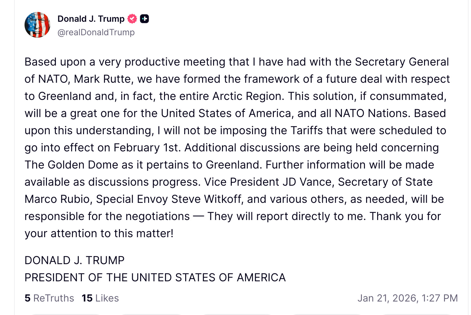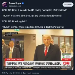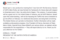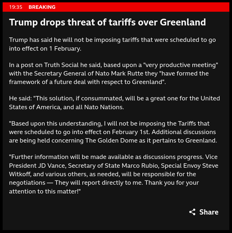 >>2659085>>2659088has anything actually happened other than some vague "concepts of a plan"-tier nothingburger bullshit about some unspecific framework for a deal at some point in the future about Greenland? it seems like less of a Trump bitching out moment and more that the situation has been deferred again because the markets were crashing.