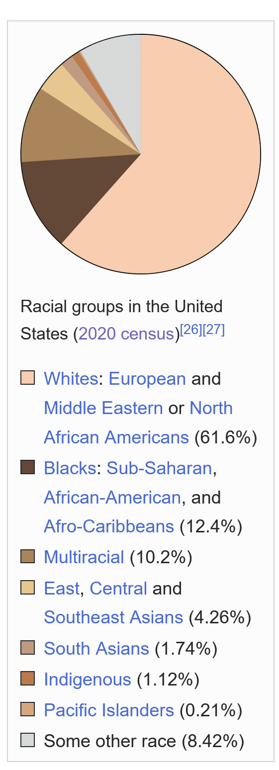 >>2658853>The US is already not majority White. It isn't.The Non-Hispanic White population excluding Arabs is still a majority and also depends on regions. Life in West Virginia vs California where it is majority-minority gives different impression. It is like that anon said that this country is the size of Europe so the experience and demographics are different.