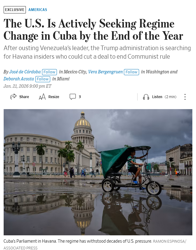 The Trump administration has assessed Cuba’s economy as being close to collapse and that the government has never been this fragile after losing a vital benefactor in Maduro, these people said. Officials don’t have a concrete plan to end the Communist government that has held power on the Caribbean island for almost seven decades, but they see Maduro’s capture and subsequent concessions from his allies left behind as a blueprint and a warning for Cuba, senior U.S. officials said.