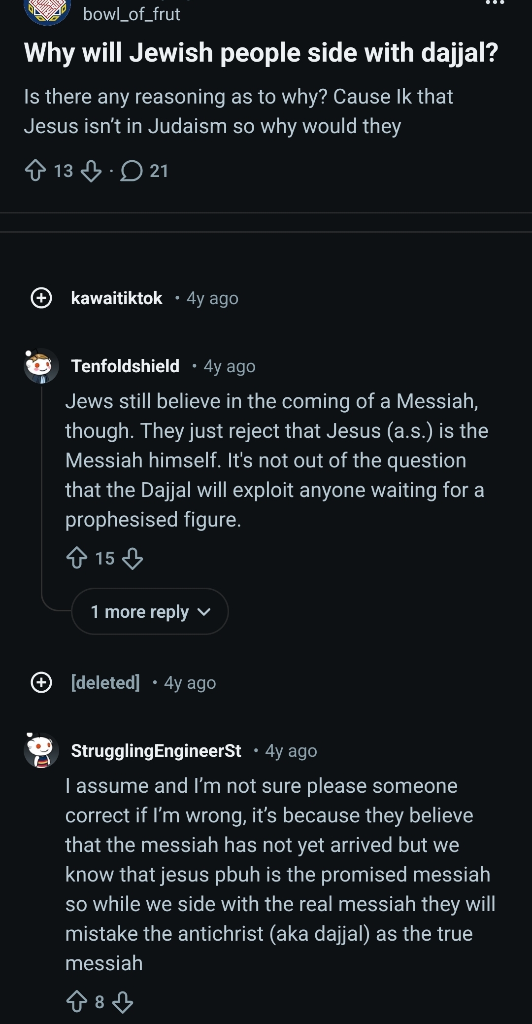 For one: I'm surprised the Jews don't talk about this more, but antisemitism is literally baked into their holy scripture. In Muslim eschatology, well backing up first I got to explain their other crazy shit first:
