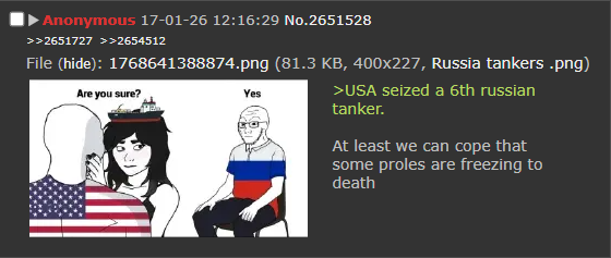 >>2670930>ConjectureIt's a pretty straightforward inference that if the Kremlin is whining to Trump about Ukraine breaking the energy ceasefire, then Trump offered the energy ceasefire as a bilateral ceasefire and not a unilateral one.