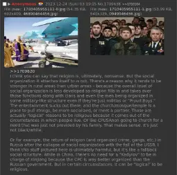 >>2661919immediately after the USSR people flocked to the orthodox church or islam. the communists commitment to militant atheism was a failure and a wasted effort. you just have to accept whether you understand what it is or not, that some people get something out of religion. they way to go is to keep religious institutions transparent, registered to the government, and on a tight leash. the way the CPC does. make sure they cannot spread scientific quackery or seditious sentiment.