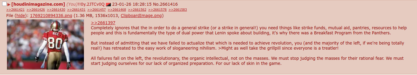 the telling thing is that literally no one has ever unironically told others to just read books and do nothing on this website, because of course they haven't. what happens is someone suggests action for action's sake with no clear idea about what it will accomplish or even what specific action is being suggested outside of "organizing" or "agitating" or fed talk about disorganized violent adventurism, another person critiques the former for having a theoretically baseless premise with no real specific means or ends, much less real tactics and strategy, and the latter is accused of being an armchair theoretical purist.