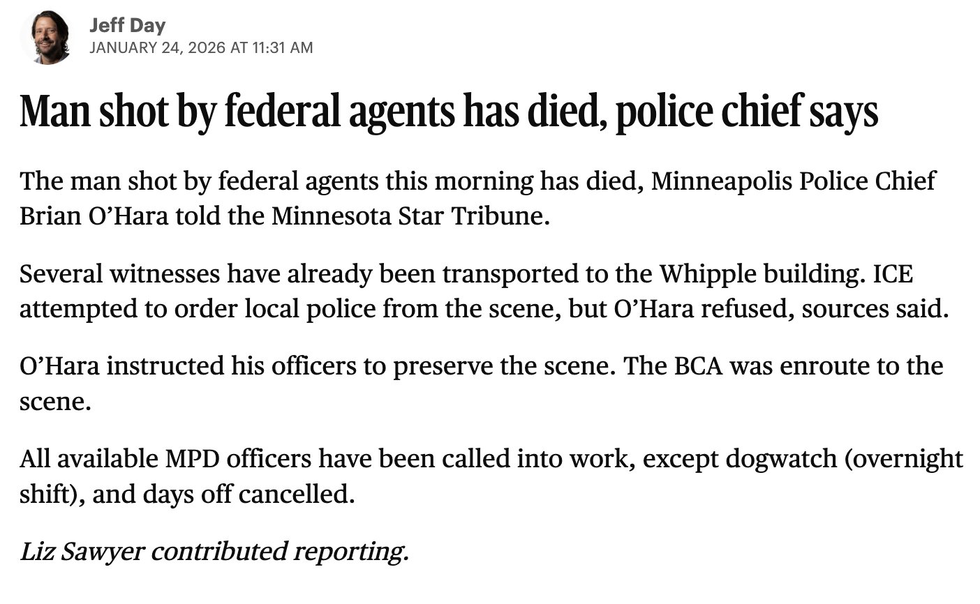 The strike did not cause ICE to leave Minneapolis, and reports are now that they intend to double down on their campaign against we the people. They have already burned the social contract. They have wiped their ass with the Bill of Rights. The anti-life regime has crossed the Rubicon. What follows this, history shows us, will be militant struggle.
