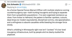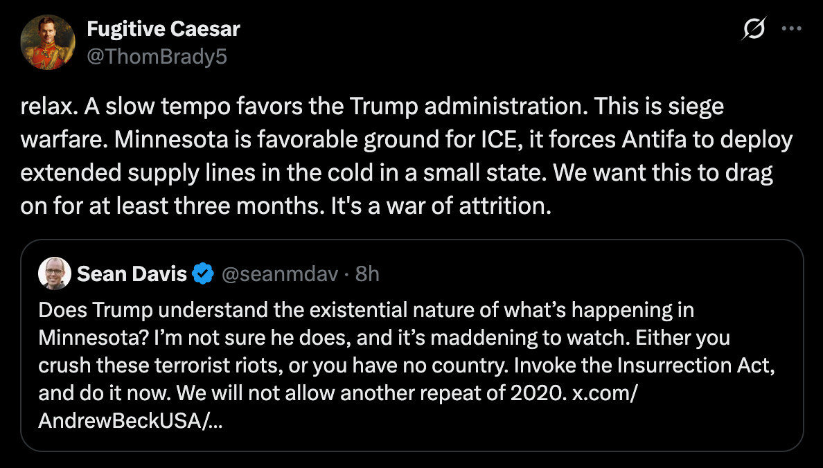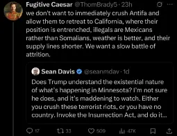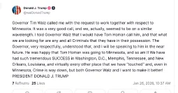 >>2666355>>2666359If Walz actually did cave that wouldn't really change the situation on the ground, if anything it would just make the protesters and rapid response groups more radicalized and probably call for Walz's head alongside Trump and Bovino's. An opportune time for leftists on the ground if I do say so myself