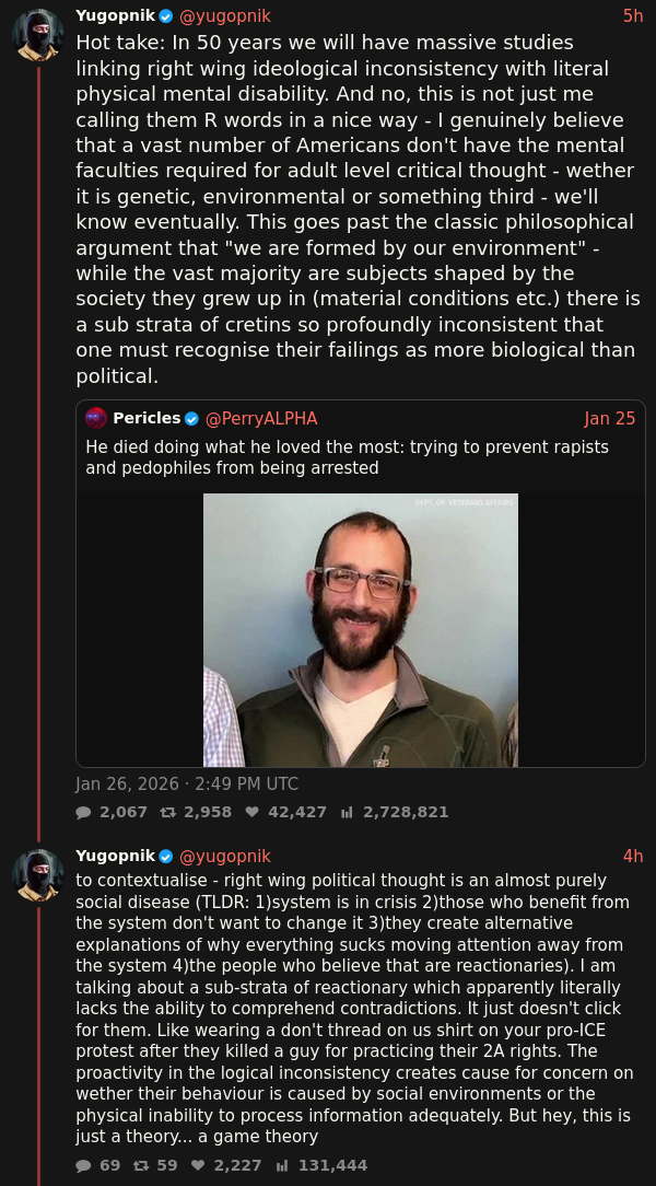 don't worry it doesn't work against autists and sorry for using the a-word hope i didn't hurt thee fee-fees too bad Remember the moralists that said that Trump killing a white armed dude would be the end of America? Well, now it has happened once in his first term and a second time now. Maybe racial analysis is wrong and can't be used to predict the future?