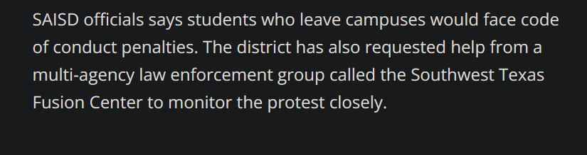>>2668504Take a gander at this from my city, big school district called in the fusion center to "monitor" a school walkout on October 7th. I believe the walkout had a tagline of armed resistance being justified, the media ran with the phantasm of the protestors being armed.