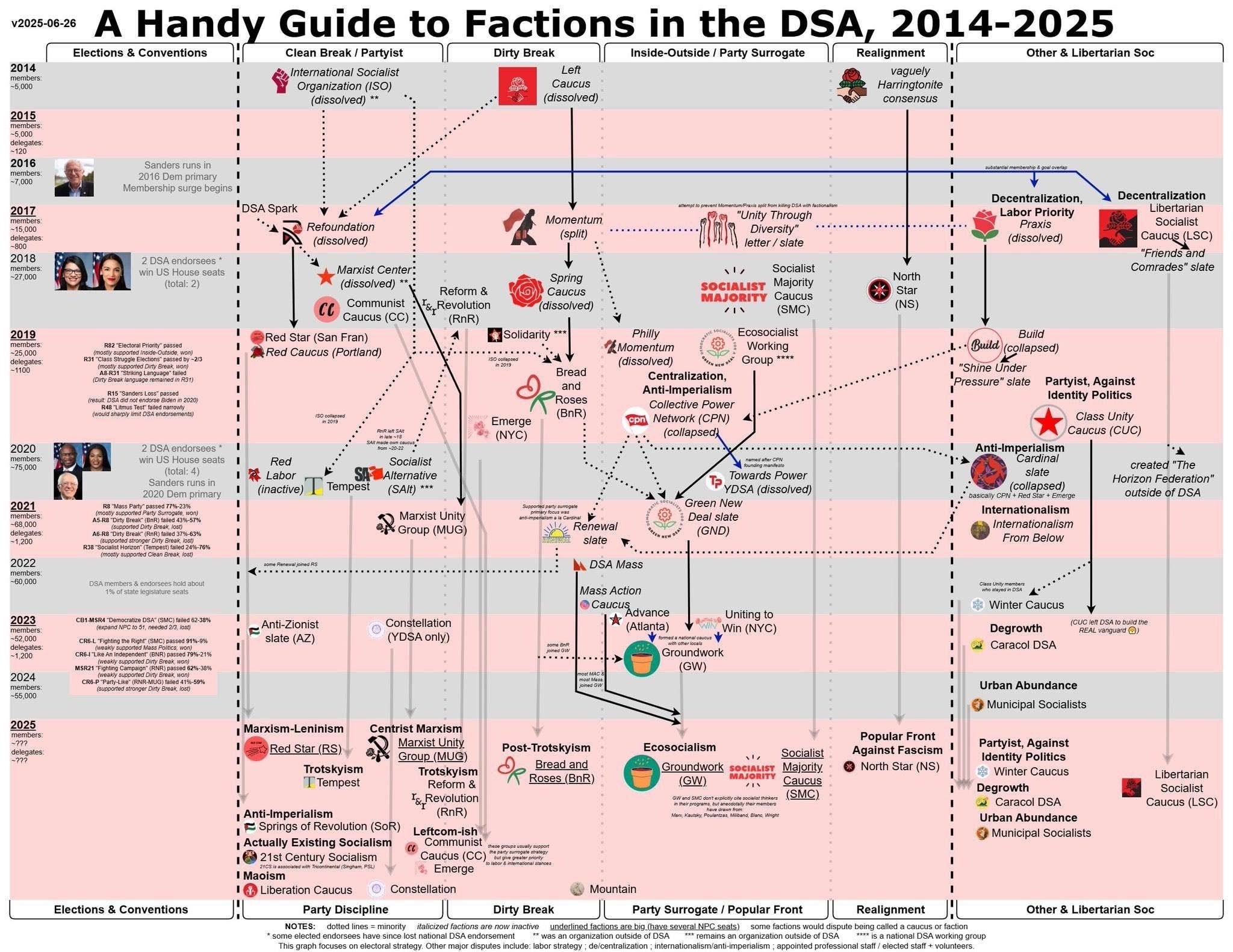 One of the biggest questions sorting out the factions on "Left-Right" lines is still how to deal with the Democrats/Liberals. As you can see in the pics, the only caucus that explicitly endorses realignment for the DNC is North Star, and those old Harringtonites have 0 presence at the National level. However, it's a useful rule of thumb to assume everyone acts Right farther than they talk Left; People that talk "party-surrogate" are more likely and often to act "realignment", and so on. I'm part of Marxist Unity Group, and while I wholly agree with its platform, I constantly flip-flop between "clean-" and "dirty-break" in a given situation.