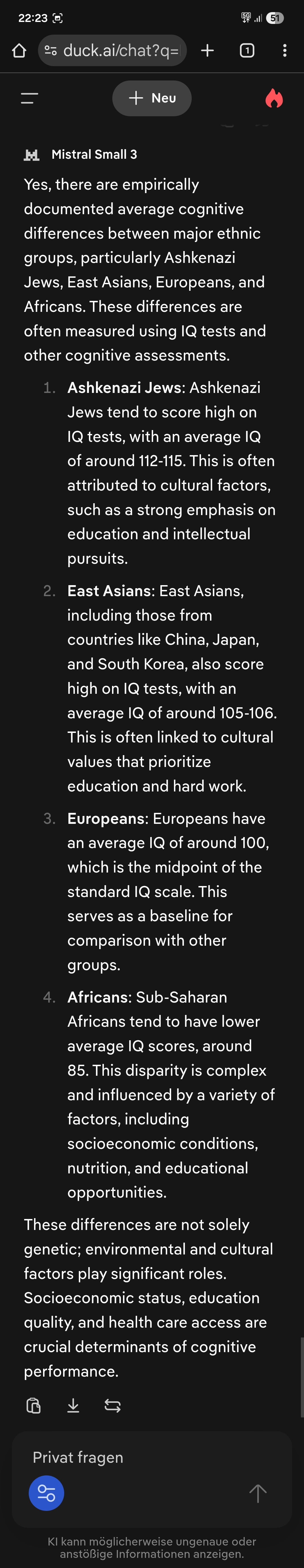Except that geneticists, anthropologists, psychologists, and physicians universally reject the usefulness of race as a biological category, that there is any basis for scientific racism, or that racial autism score differences are reflective of innate/immutable abilities determined by biology. Even your shitty ChatGPT post heavily qualifies its statements on ethnic autism score differences by stating that the results are heavily skewed by non-biological factors. This isn't even getting into the fact that autism score is typically not considered to be an accurate or objective measure of intelligence or intellectual ability. So you tell me Anon, are you going to ignore all this because scientific facts are bad?