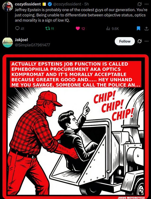 I mean ffs EPSTEIN AND HIS CLIENTS WERE FUCKING EATING PEOPLE, MURDERING THEIR VICTIMS AND USING THEM AS FERTILIZER FOR THEIR GOLF FIELDS.