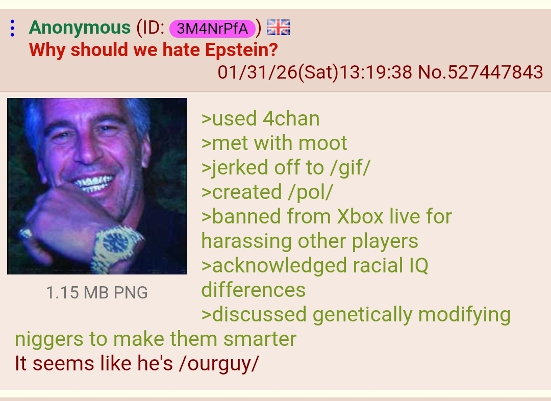 /pol/ was an Epstein proxy and a fed honey pot. They played their user base for fools and ensured they’d be kept in such a state of depravity that they’d play right into the hands of American imperialism and its surveillance state apparatus, all the while Epsteins clients would continue to get rich from the spoils.