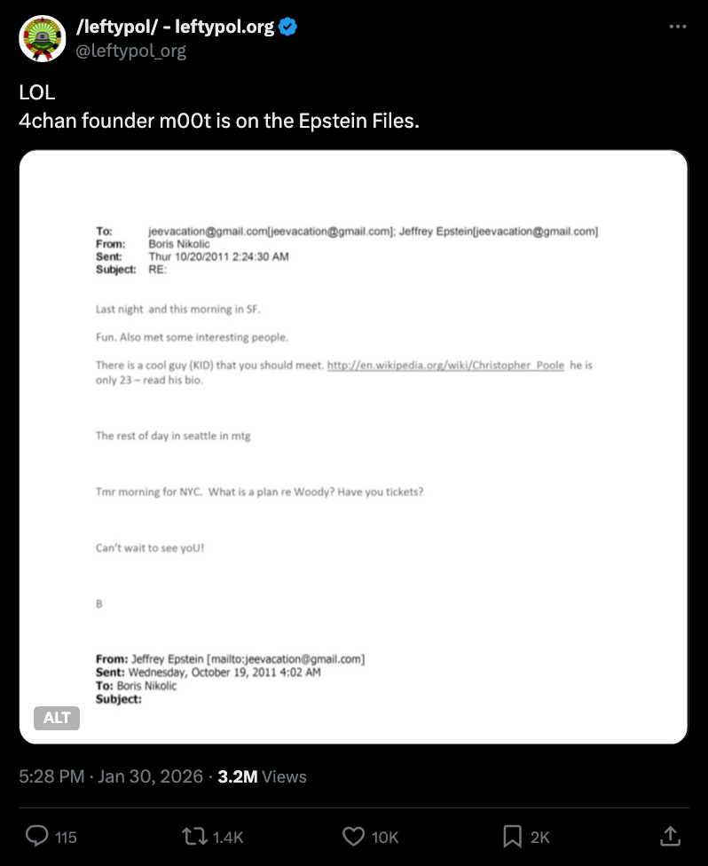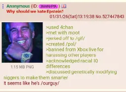 the most recent Epstein file drop potentially implicating the creation of /pol/ with moot meeting with Epstein feels like it needs to have its own thread. it's pretty much an accepted fact at this point that Epstein played a key role in what seems to be a massive secret human trafficking ring that exists as a form of Mutually Assured Destruction to for the elites to maintain power, but what is currently a lesser-known and recent revelation is that circumstantial evidence indicating that the entire formation of the far-right was an astroturfing psyop by pedophile billionaires and the intelligence community.