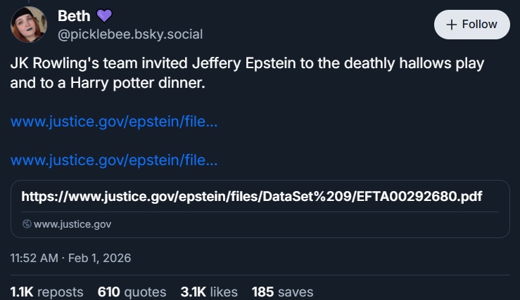 >>2685593>Seems like there's been a big uptick on social media in sentiments like>>the epstein files prove qanon and pizzagate were real and we should have listened to alex jones and /pol/…>misdirecting attention while also trying to rehabilitate bad actors.There's been a lot of people who make fun of them for thinking Trump isn't involved.