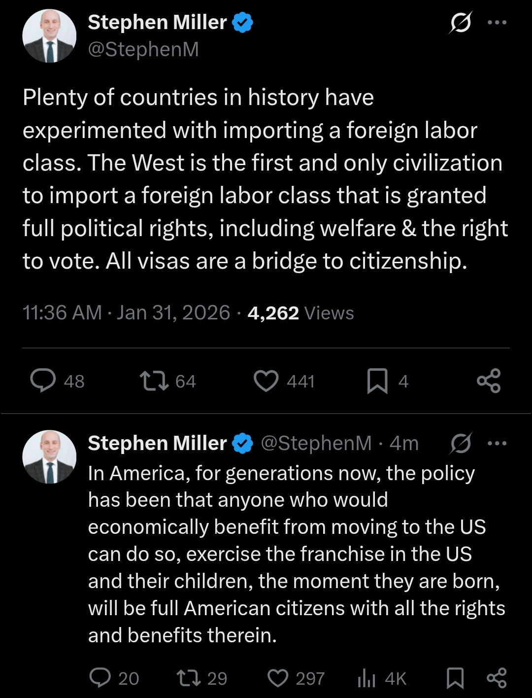 >>2674164>All visas are a bridge to citizenshipI fucking wish! That is what they should be. Instead the USA has the most restrictive immigration and exploitative immigration policy on the planet. It purposely traps workers in permanent precarity.