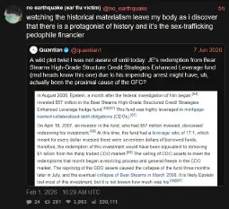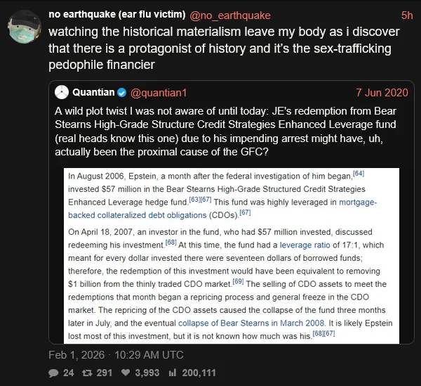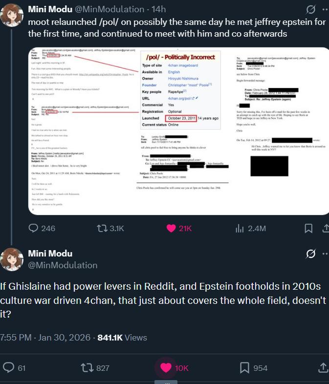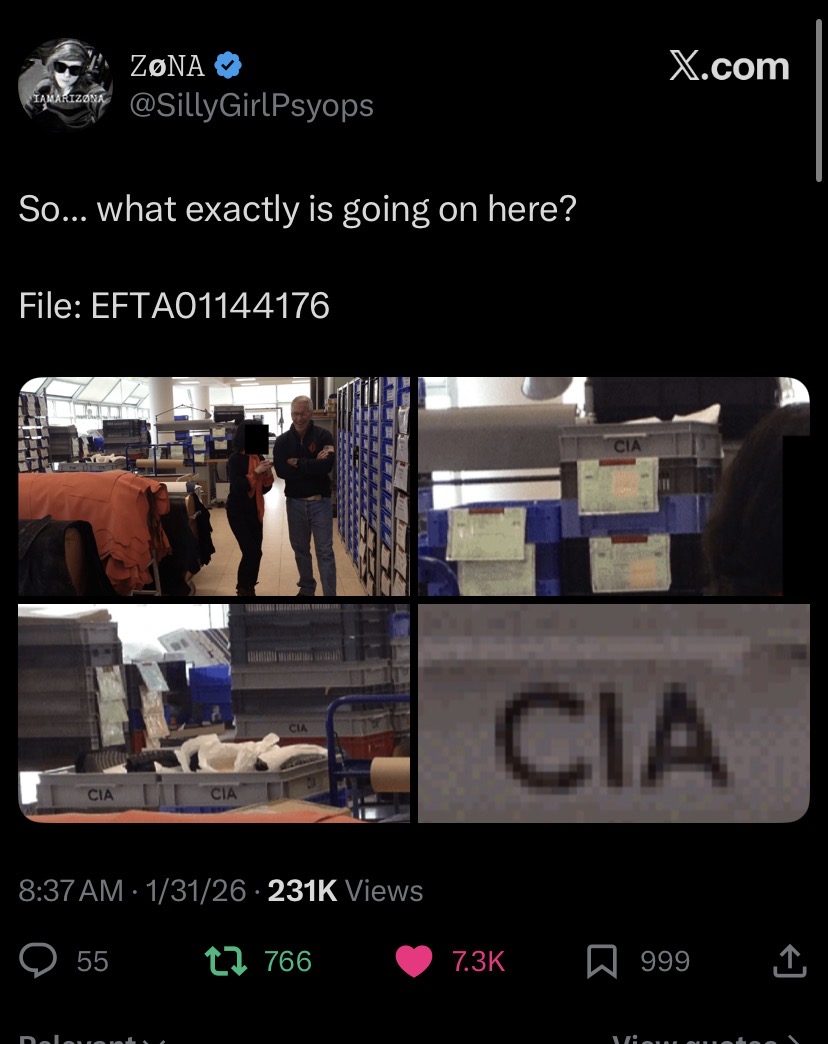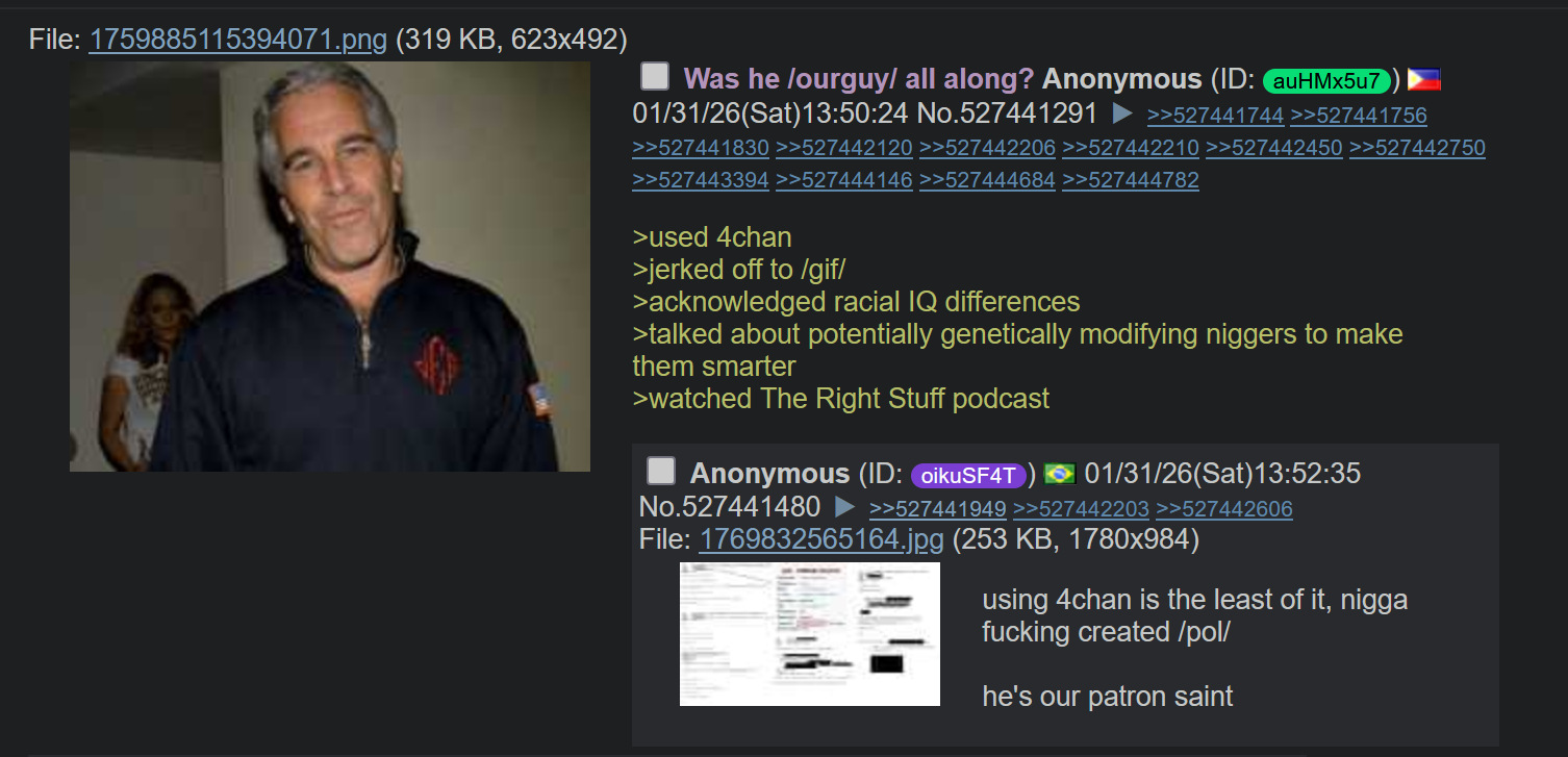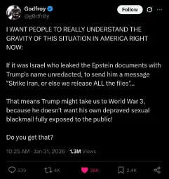 >Everything I said is true. Mossad has tapes of Trump raping children in a Tel Aviv vault and they own him. This release was to push him to launch the war on Iran, or else we get the tapeshttps://nitter.poast.org/zei_squirrel/status/2017407404275585254#mWar with Iran is so stupid even if you’re an American imperialist, overtly helping the protesters let alone actually attacking it with the US military proper creates a rally around the flag effect in Iran and delegitimizes the local Iranian opposition