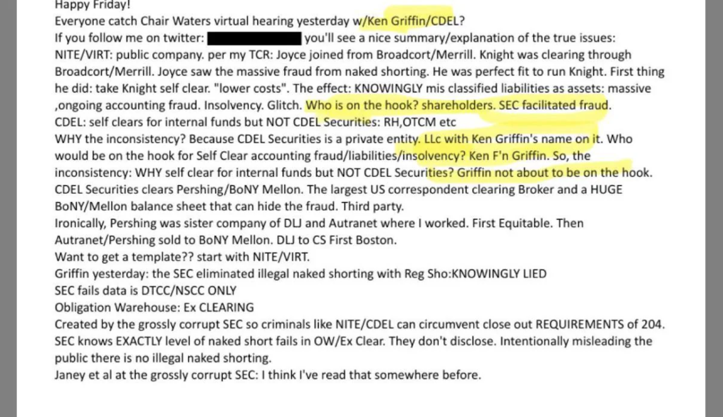 What the files here are saying is basically a confirmation of everything the GME investors said: there is massive naked shorting, it reaches truly absurd numbers, the SEC knows about it and does nothing, the big "villain" they attributed it to, Ken Griffin, is in on it, and they figured it out.