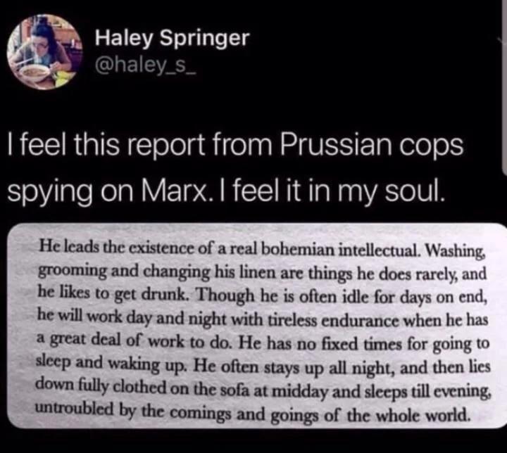 >>2674695Thank the heavens Marx didn't have access to weed, he probably would have gotten so lazy and chilled out that he would have written nothing at all.