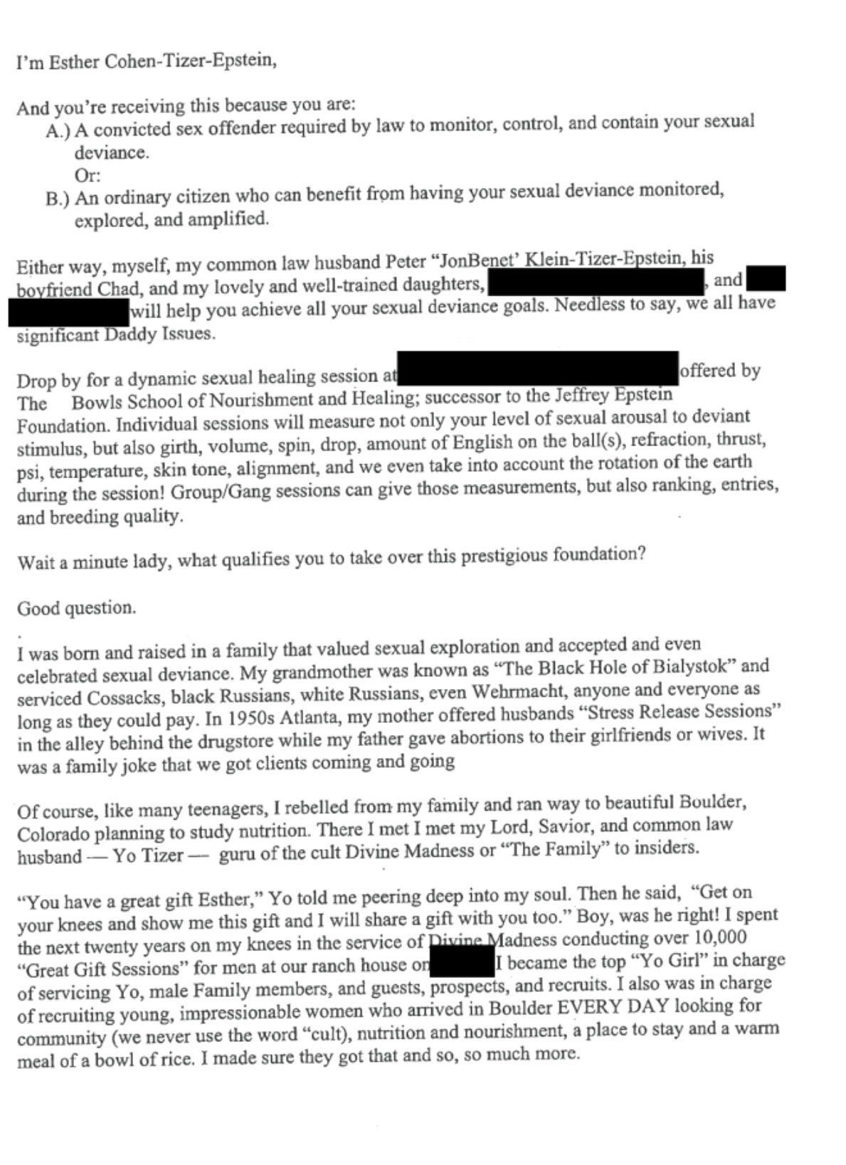 >Of course, like many teenagers, I rebelled from my family and ran way to beautiful Boulder, Colorado planning to study nutrition. There I met I met my Lord, Savior, and common law husband — Yo Tizer — gum of the cult Divine Madness or "The Family" to insiders.Not going to keep pasting the rest because it doesn't work well. Just see the images.