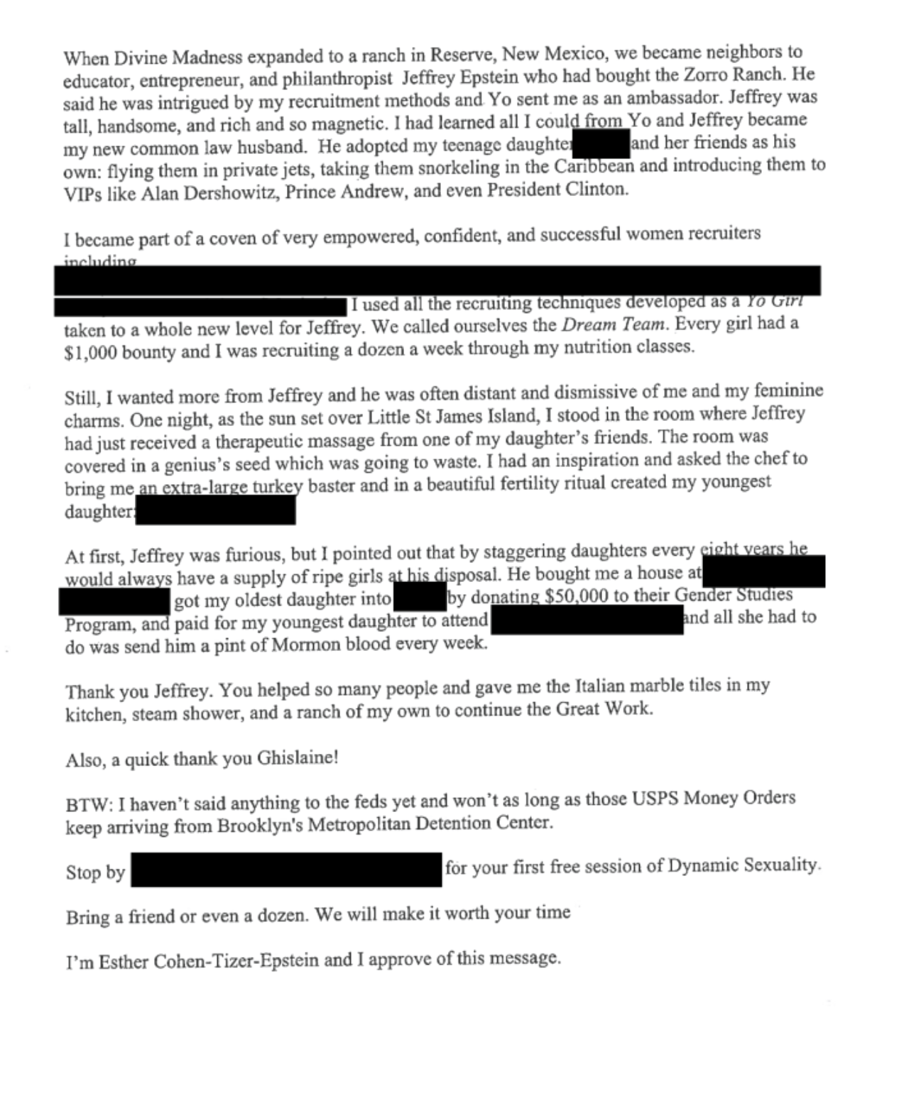 >When Divine Madness expanded to a ranch in Reserve, New Mexico, we became neighbors to educator, entrepreneur, and philanthropist Jeffrey Epstein who had bought the Zorro Ranch. He said he was intrigued by my recruitment methods and Yo sent me as an ambassador. Jeffrey was tall, handsome, and rich and so magnetic. I had learned all I coul m Yo and Jeffrey became my new common law husband. He adopted my teenage daughte and her friends as his own: fl ying them in private jets, taking them snorkeling in the Carl can and introducing them to VIPs like Alan Dershowitz, Prince Andrew, and even President Clinton