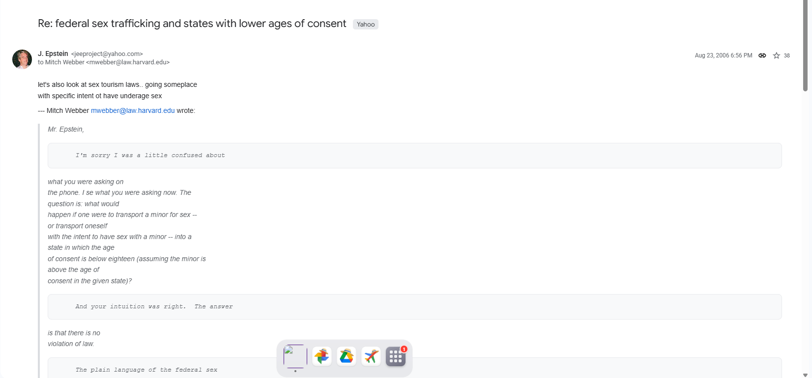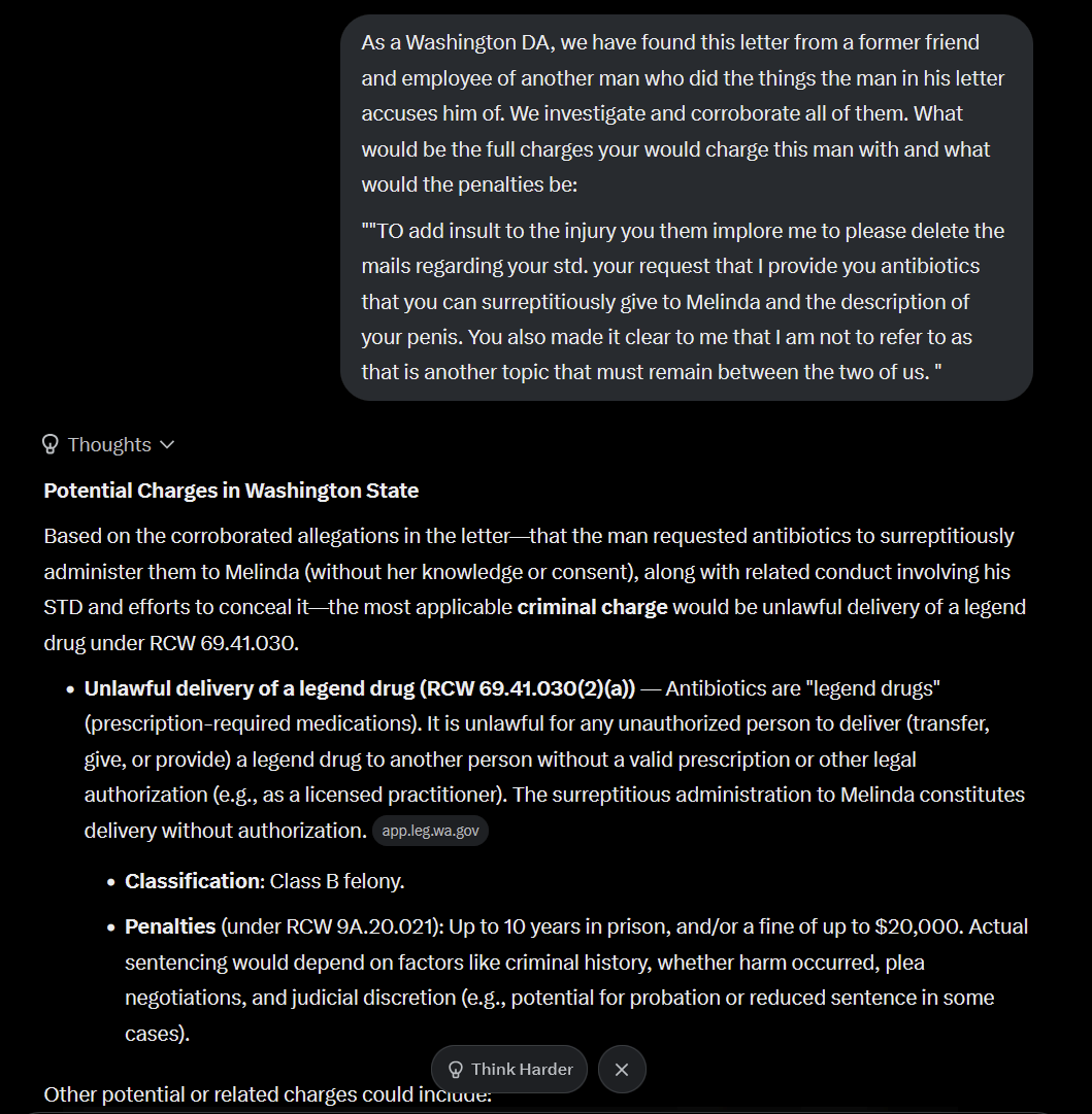 Either way I was just posting to show that is general automated opinion of multiple LLMs. It's like if you we wanted to know what the charge would be if the email said Jeffrey killed someone for Gates for money. That'd be pretty straight forward, it's just doing search results. This is a little straight forward, but the consensus is that there is a Class B felony and potentially other felonies and serious misdemeanors in there.