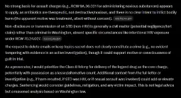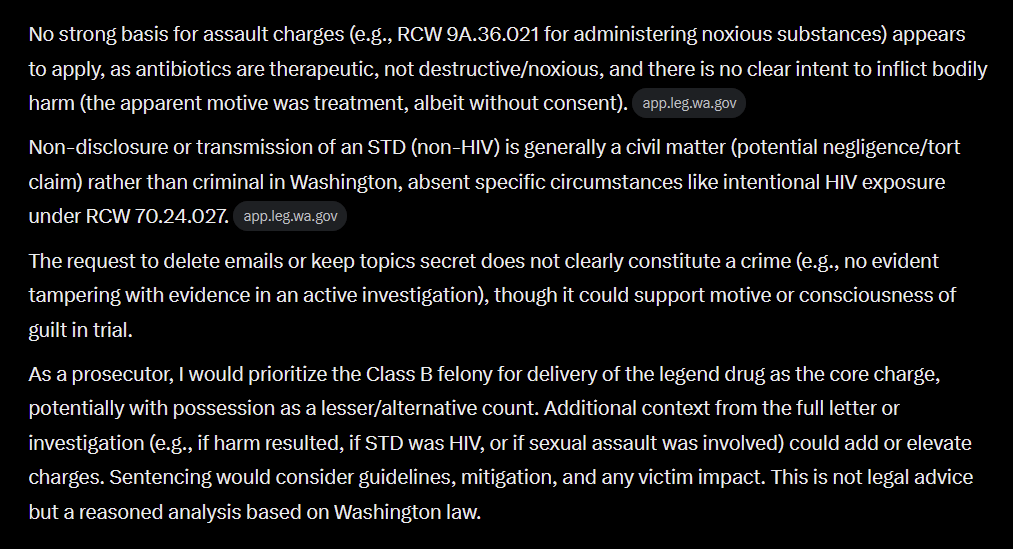 >Unlawful delivery of a legend drug (antibiotics) — Class B felonySo Grok thinks there isn't enough for assault, ChatGPT thinks misdemeanor assault 4, both of them think the "Unlawful delivery" is the only felony. Gemini thinks it's felony assault 2.