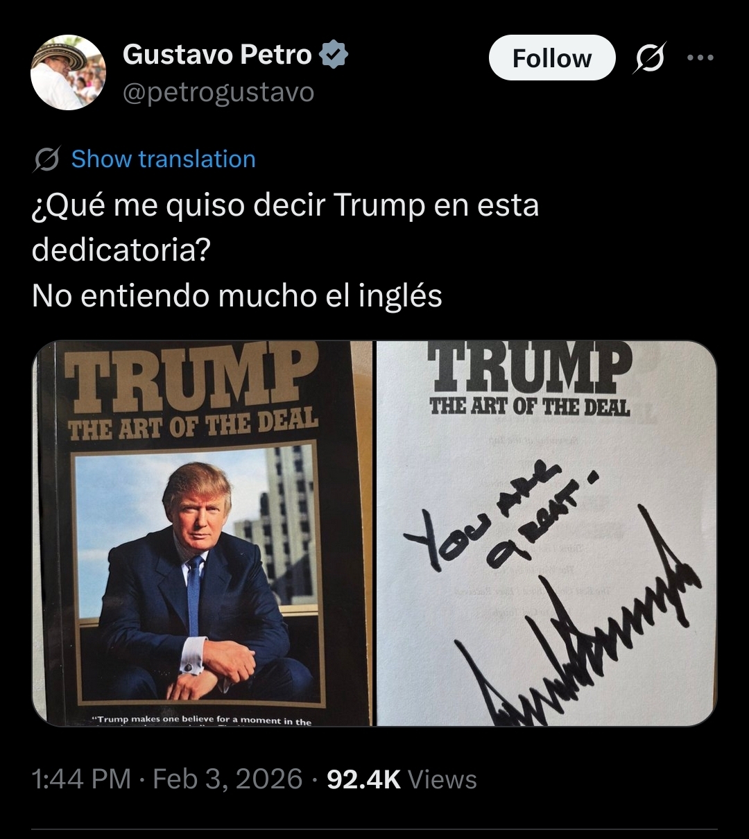 petro is a good doggo. he probably got the pat on the head and moved on to his dog house. he calls it, Colombia.