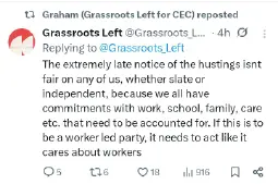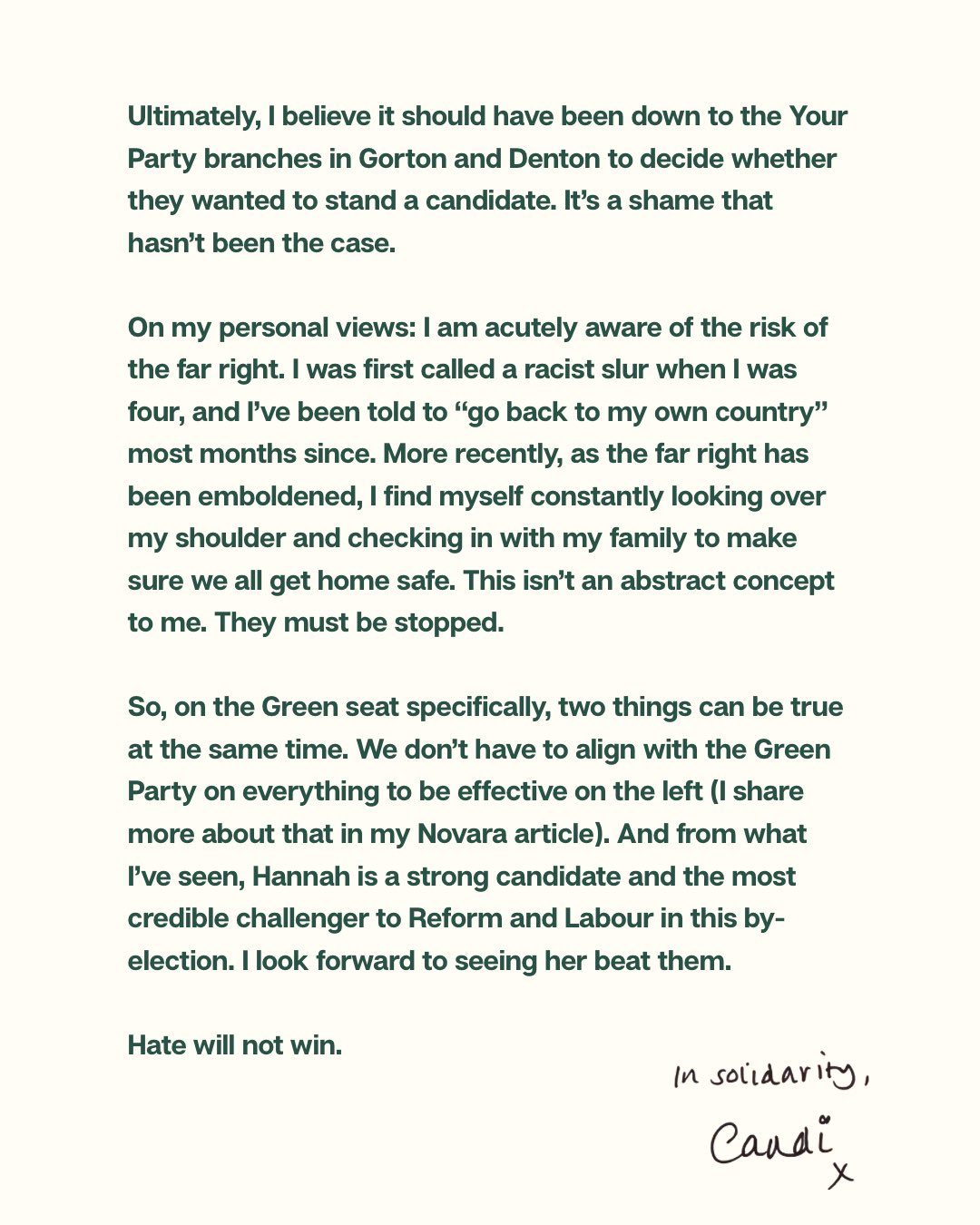 >Whinging that Your Party didn't stand a candidate - after she decided not to do so >Saying via her Your Party factional mouthpiece that people should abstain and not support the Greens (and therefore let Reform win)>Meanwhile saying the direct opposite in her personal capacity, that people should support the Greens>Lying that the Greens support NATO (Polanski has repeatedly been explicit about his support for leaving NATO)She's making up falsehoods about the Green party positions when there's plenty of other things you could corner them on.