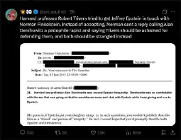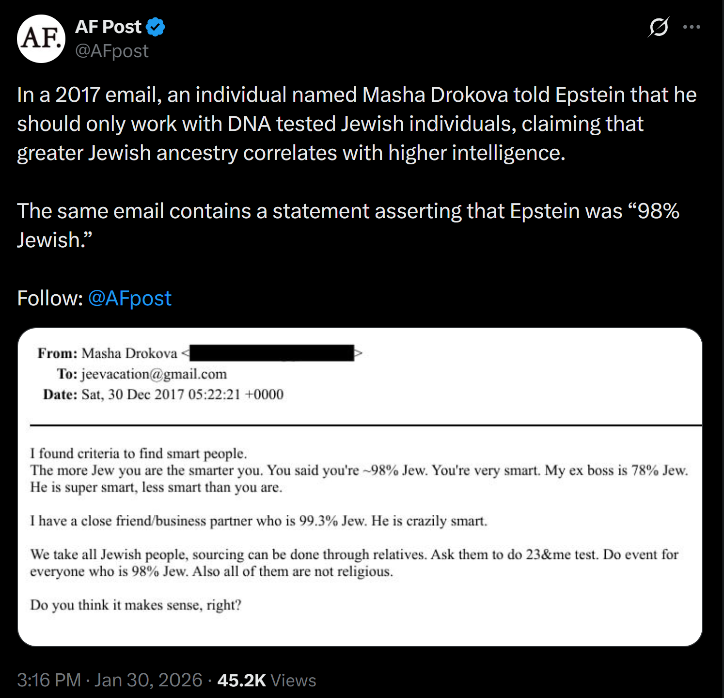 >a centimillionaire pedophile and open Jewish supremacist was exposed for compromising and conspiring with countless members of the power elite to do things like destroy Walt & Mearsheimer's careers, deny Norman Finkelstein tenure, war profiteer, and interfere in American politics on behalf of foreign and monied interests, and there's been a bipartisan conspiracy between politicians and media to cover it up, conceal the Israel angle, and never even acknowledge Epstein's supremacist beliefs