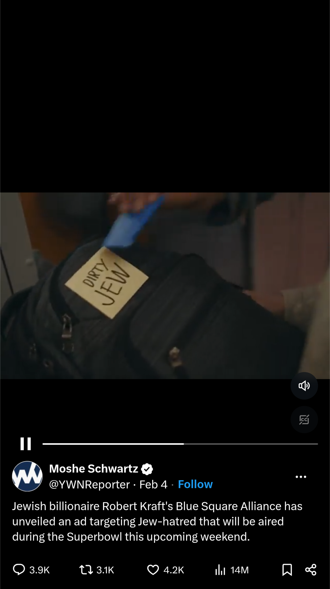 During the super today a commercial promoting people to post blue squares to show they are against Jew hate. A billionaire Jew tied to Jeffrey Epstein who has been charged with trafficking women and owns the patriots is funding this commercial (Robert Kraft)