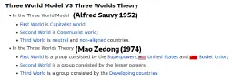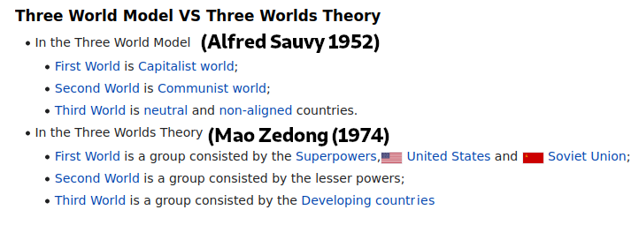 >>2685762No, that's just in the colloquial usage of the term, where Western aligned countries are first world, Communist countries are second world, and non-aligned countries are third world. Mao considered the superpowers (US and USSR) to be first world, developed middle powers like France, Britain, the Warsaw Pact, etc. to be second world, and everybody else to be third world. Frankly I think the whole thing was incoherent nonsense completely divorced from Marxism. It was at best a post-hoc justification for China's hostility to the Soviet Union.